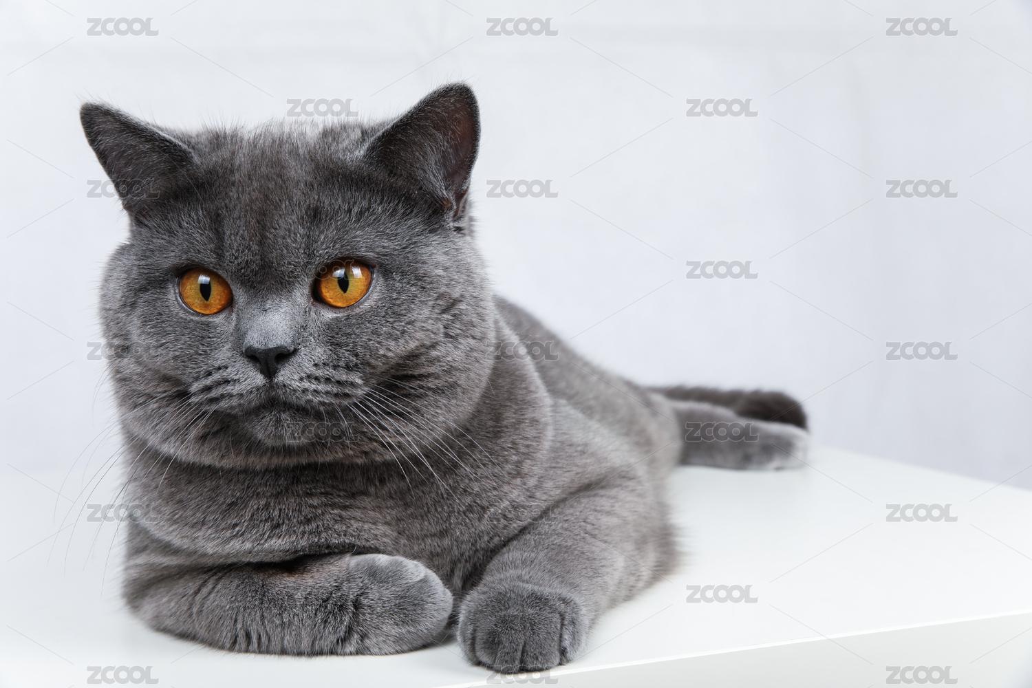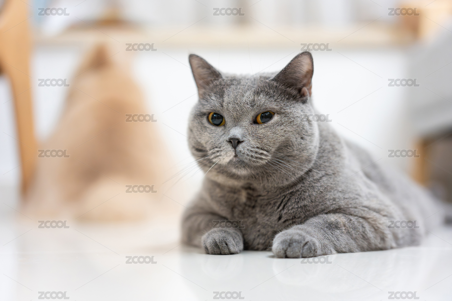 有些肥胖英国短毛猫舔完毛后看着周围的环境