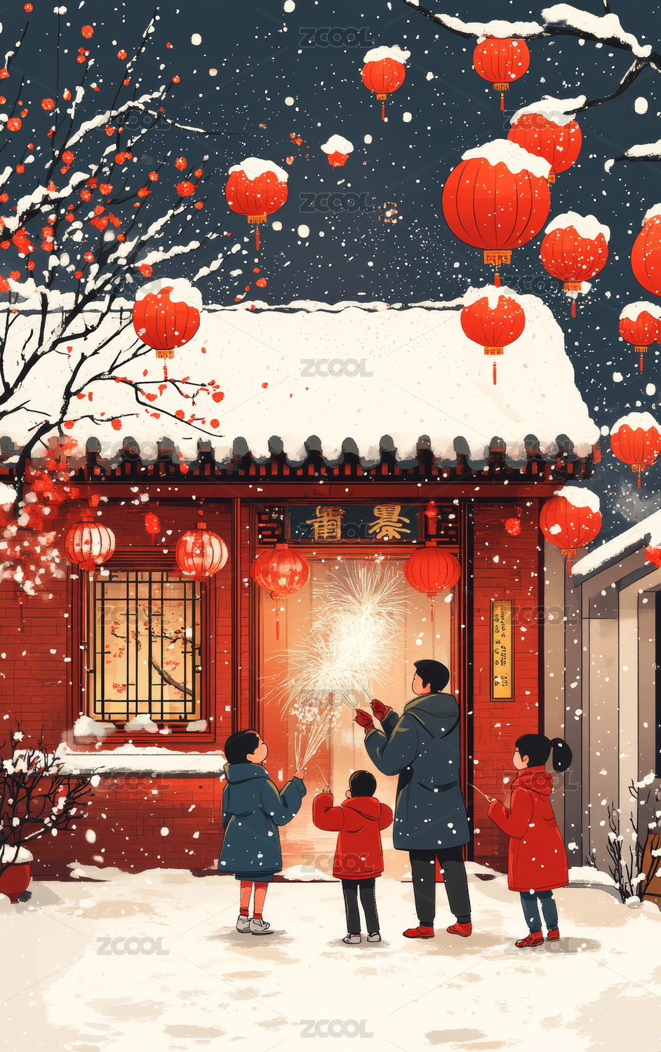 雪夜庭院家人团聚欢庆新年