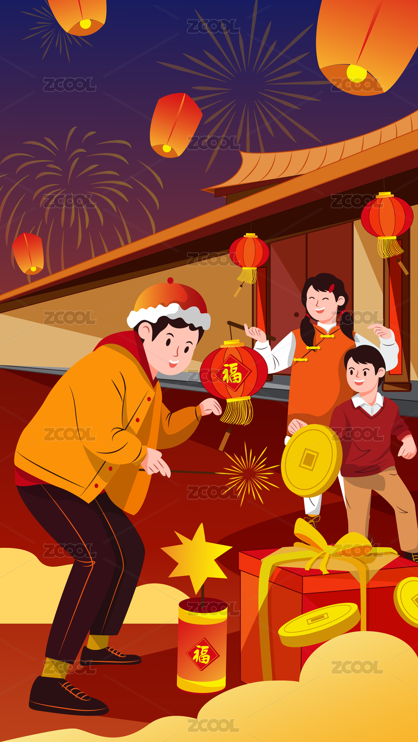 国潮风一家人团圆看烟花新年插画