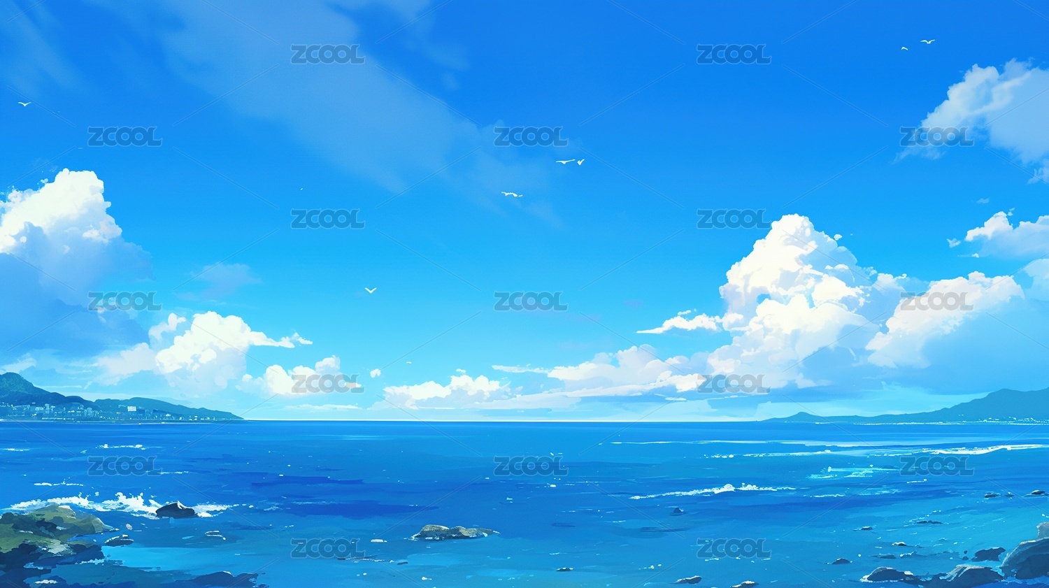 AIGCFG01,新海诚风格,日漫,插画,卡通,风景,动物,海鸥,大海,蓝天