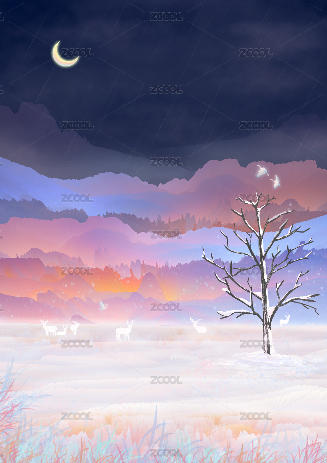 下雪天立冬大雪大寒林海雪原白鹿插画