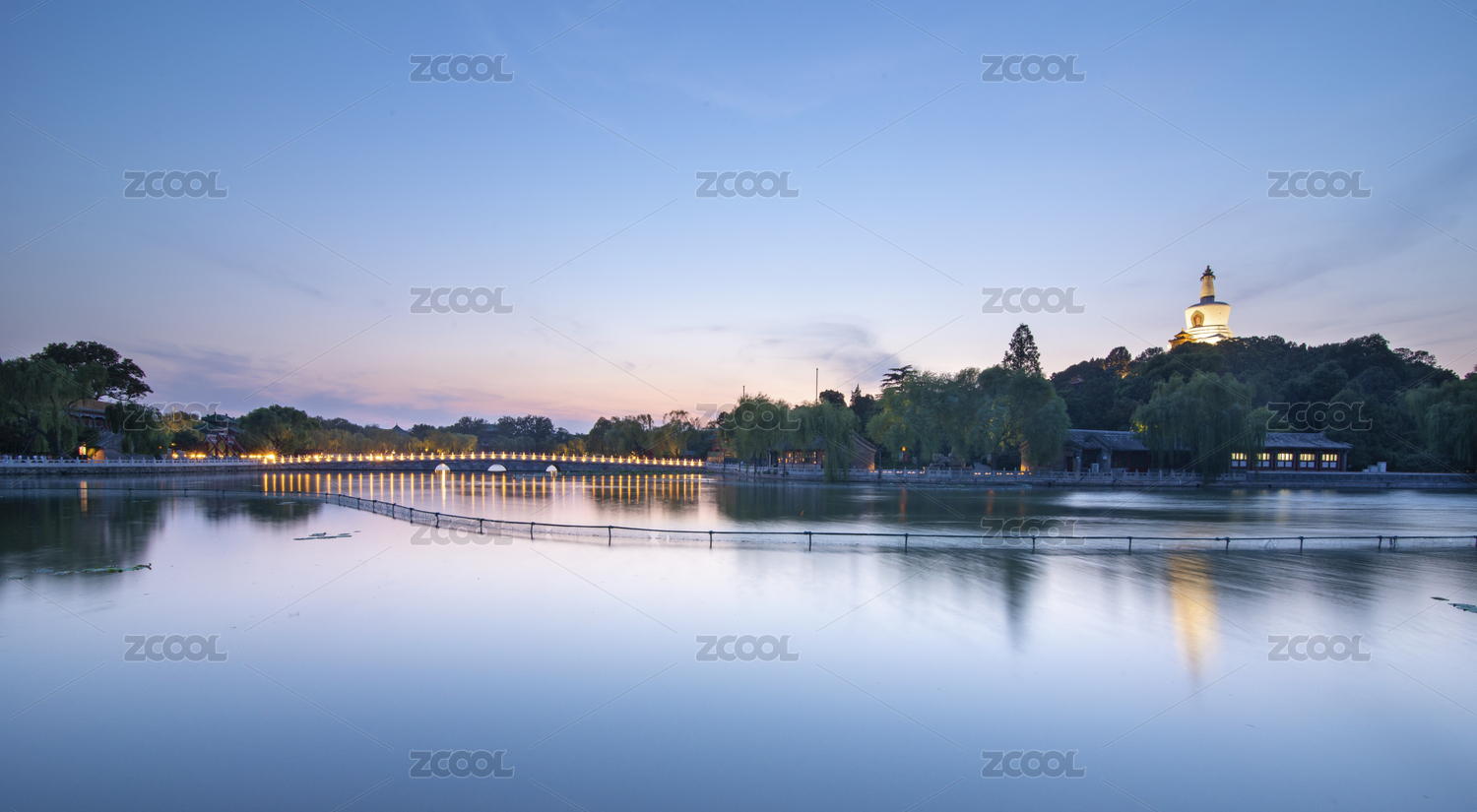 北京北海公园桥和白塔水天相接的日落风光