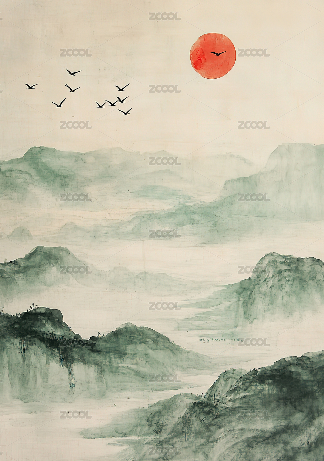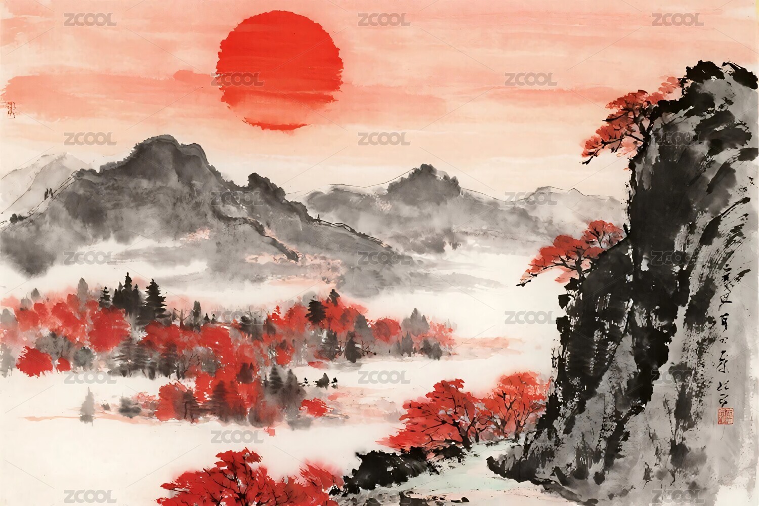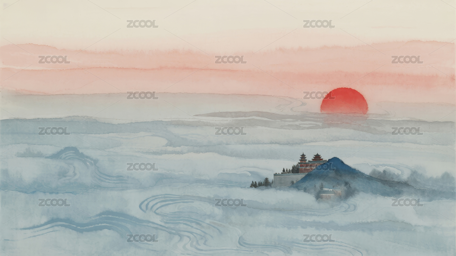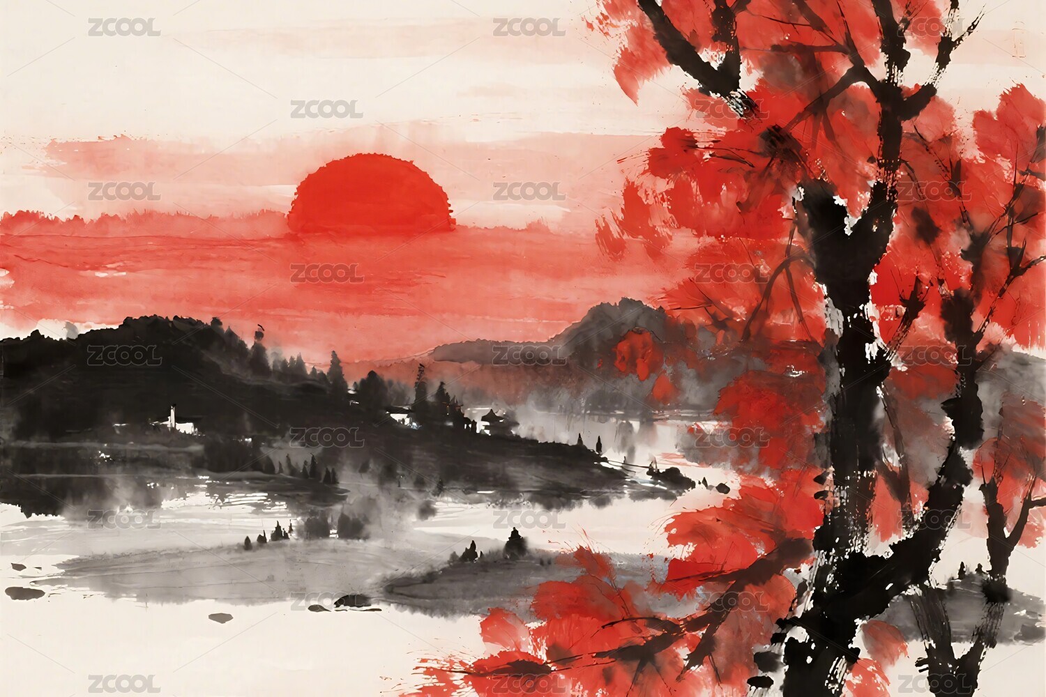 水彩画,艺术,绘画,插画,水墨画,日落,太阳,水,水面,反射