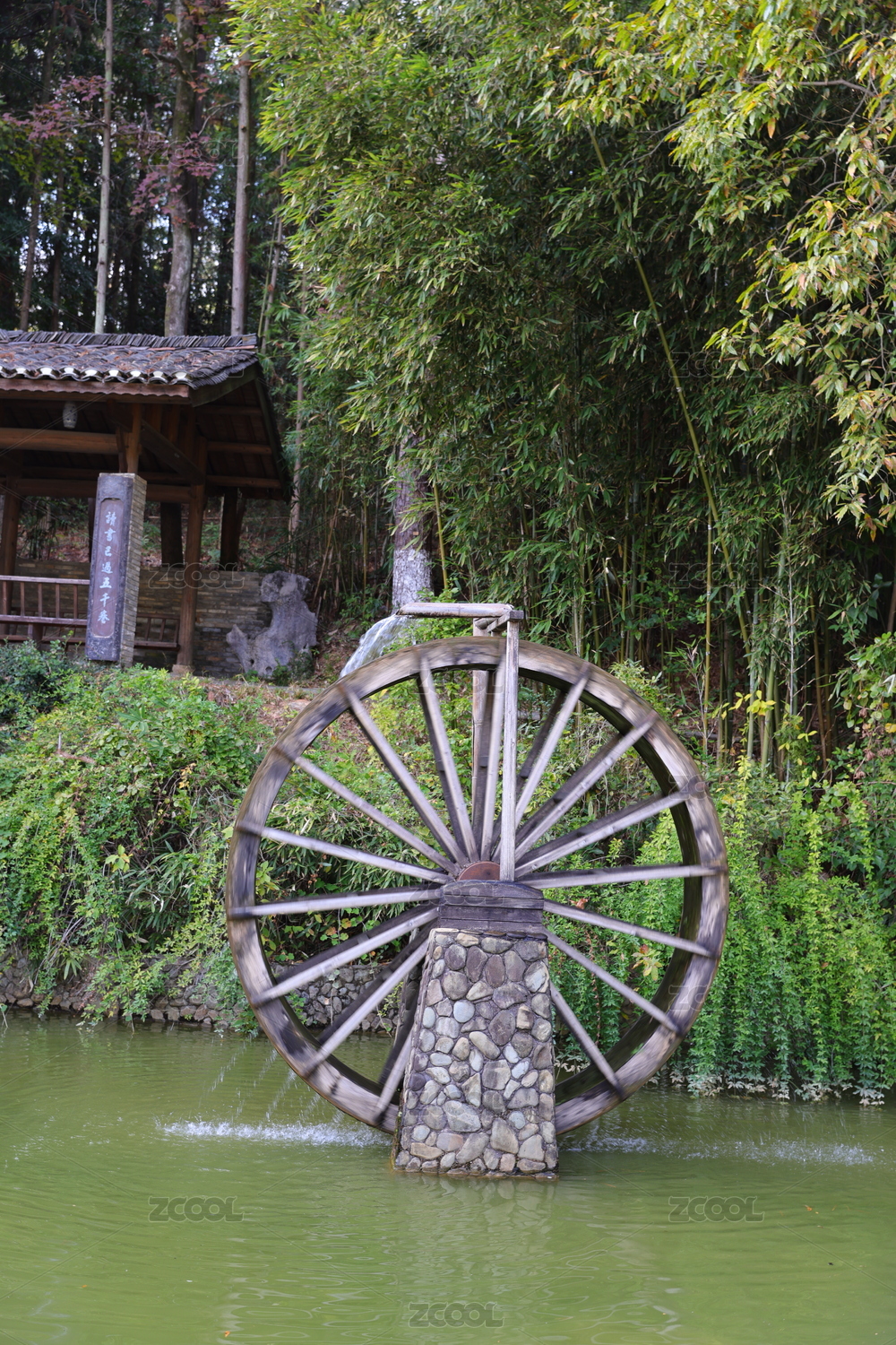 古老的水车青砖墙拱形门