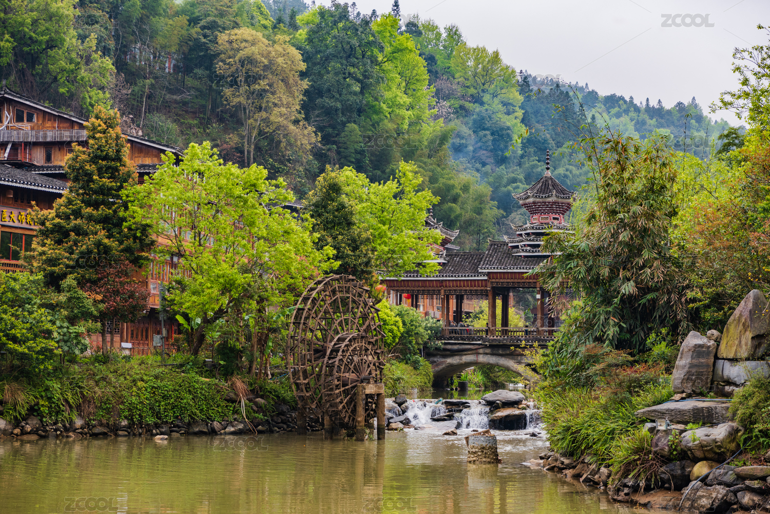 肇兴侗寨里的风雨桥与水车