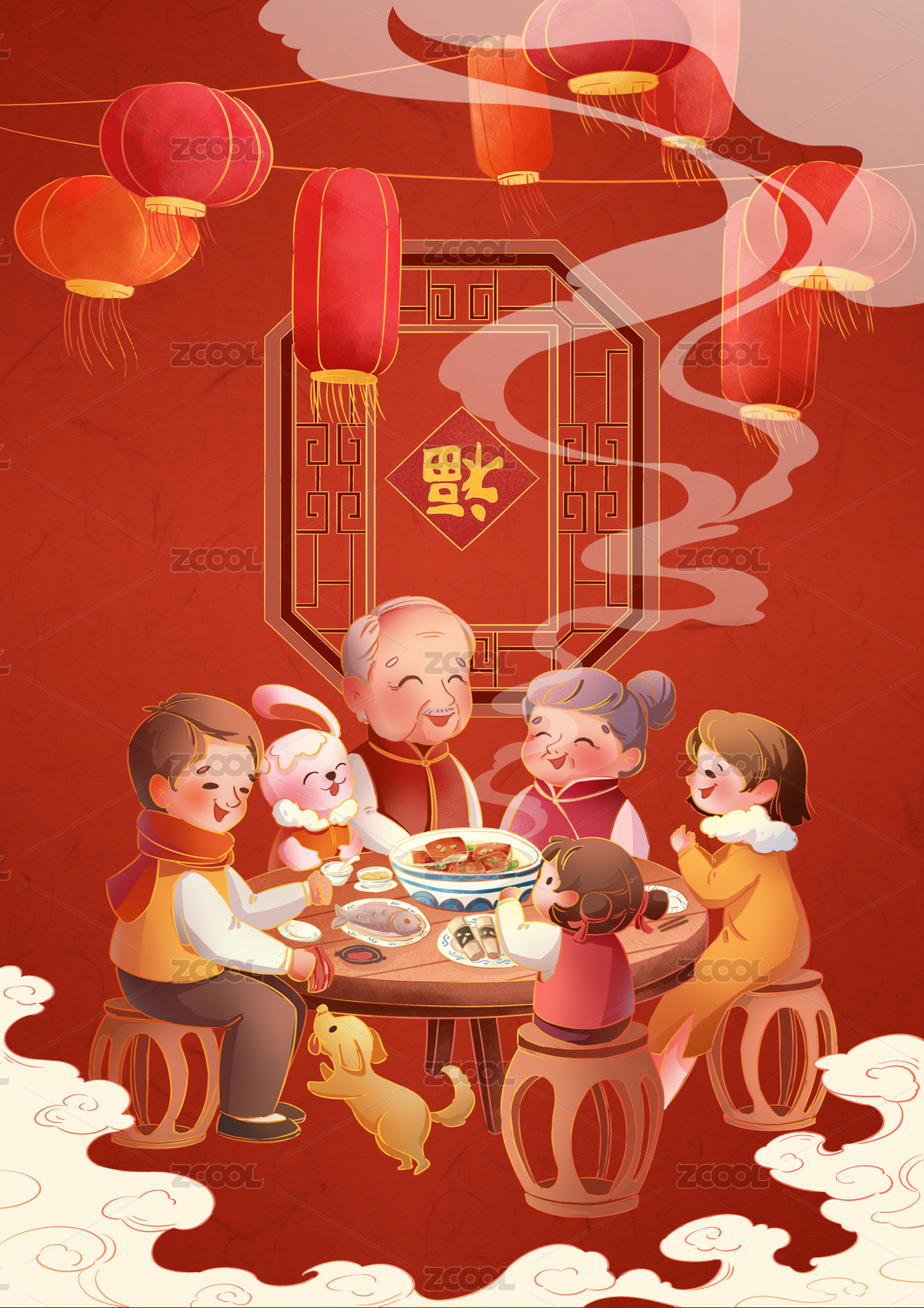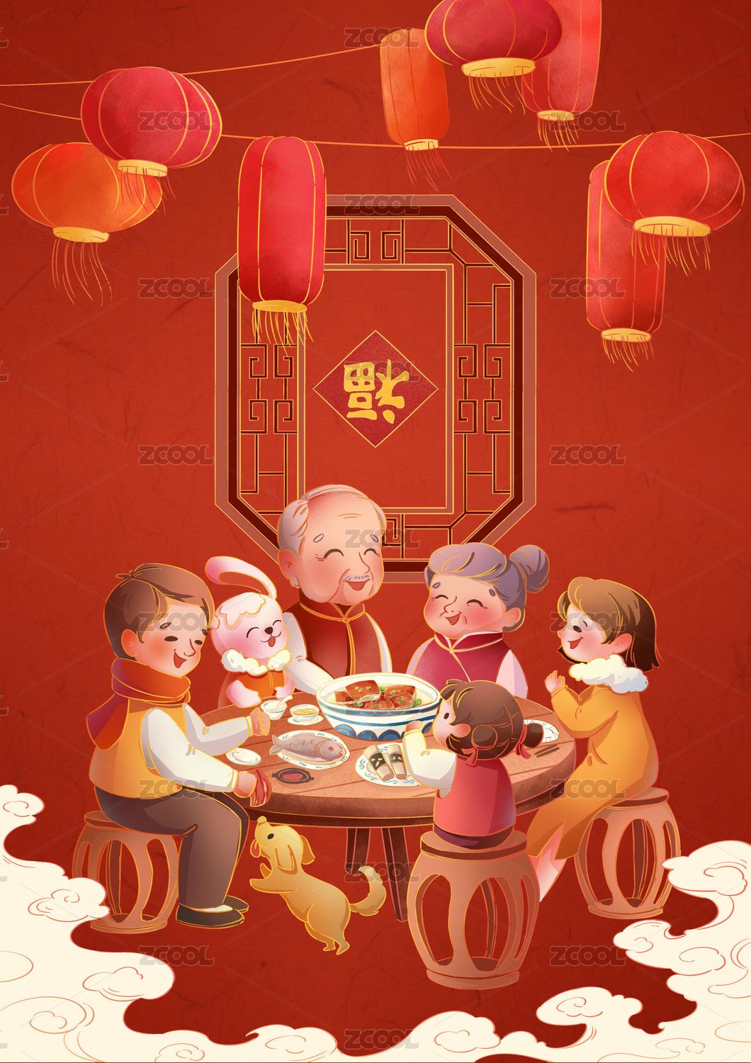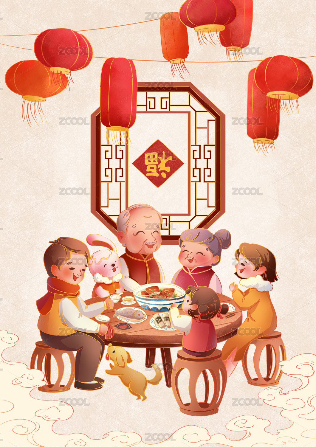 新年一家人在除夕夜吃团圆饭的年俗插画