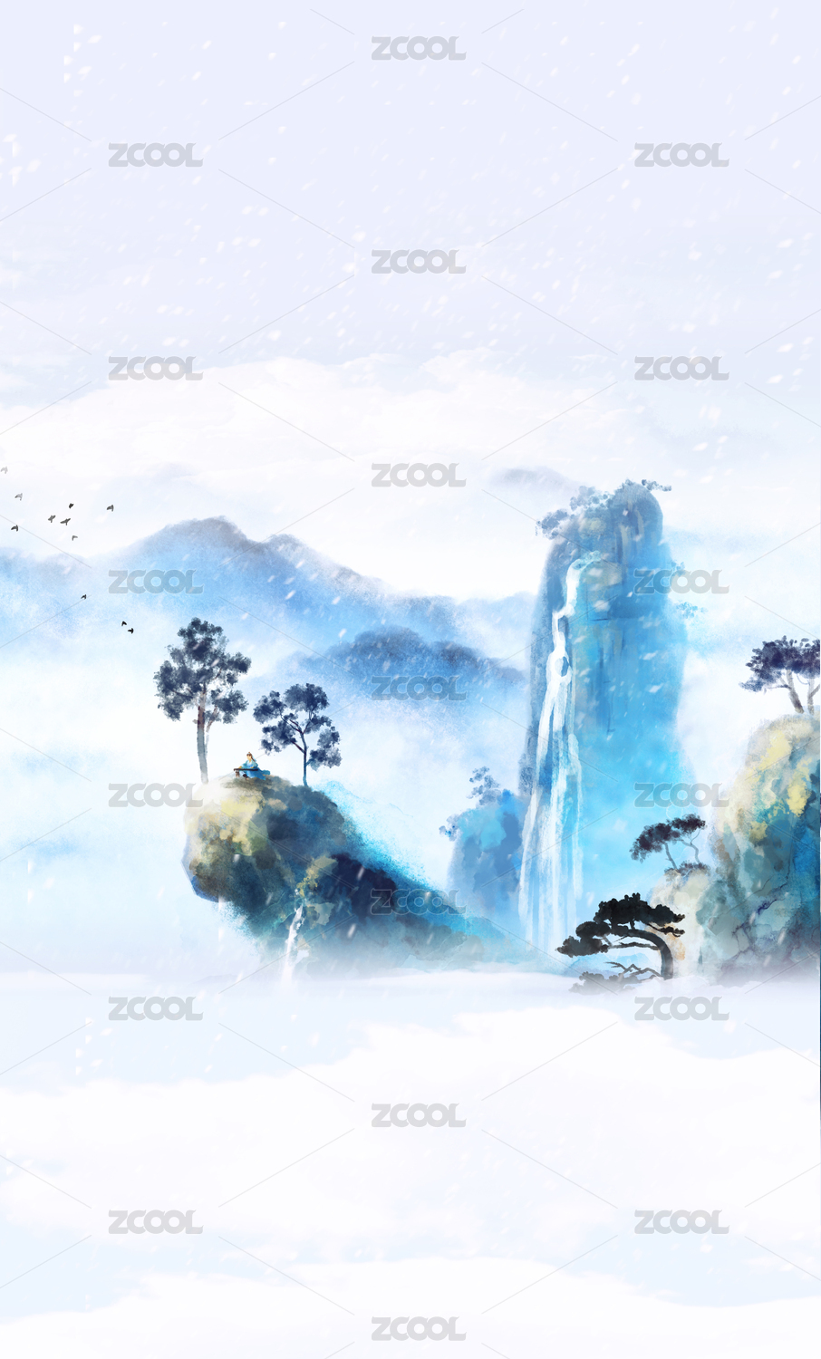 手绘竖版中国风蓝色意境山水画