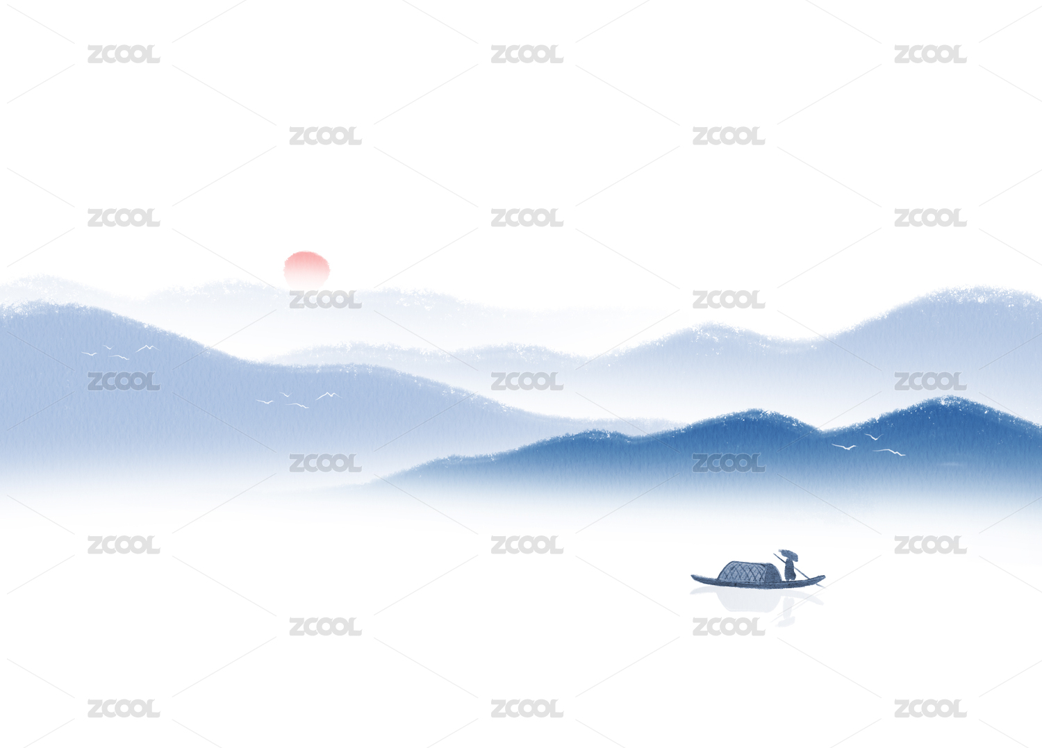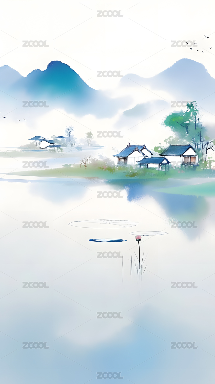 水彩意境山水画背景插画