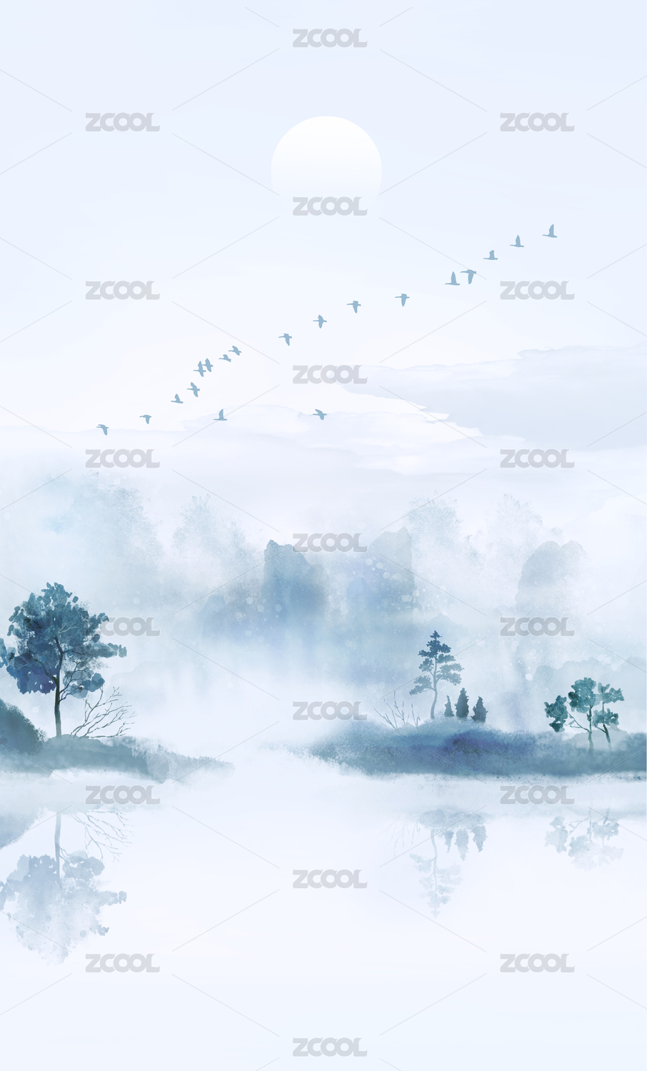 水彩意境蓝色山水画竖版背景插画
