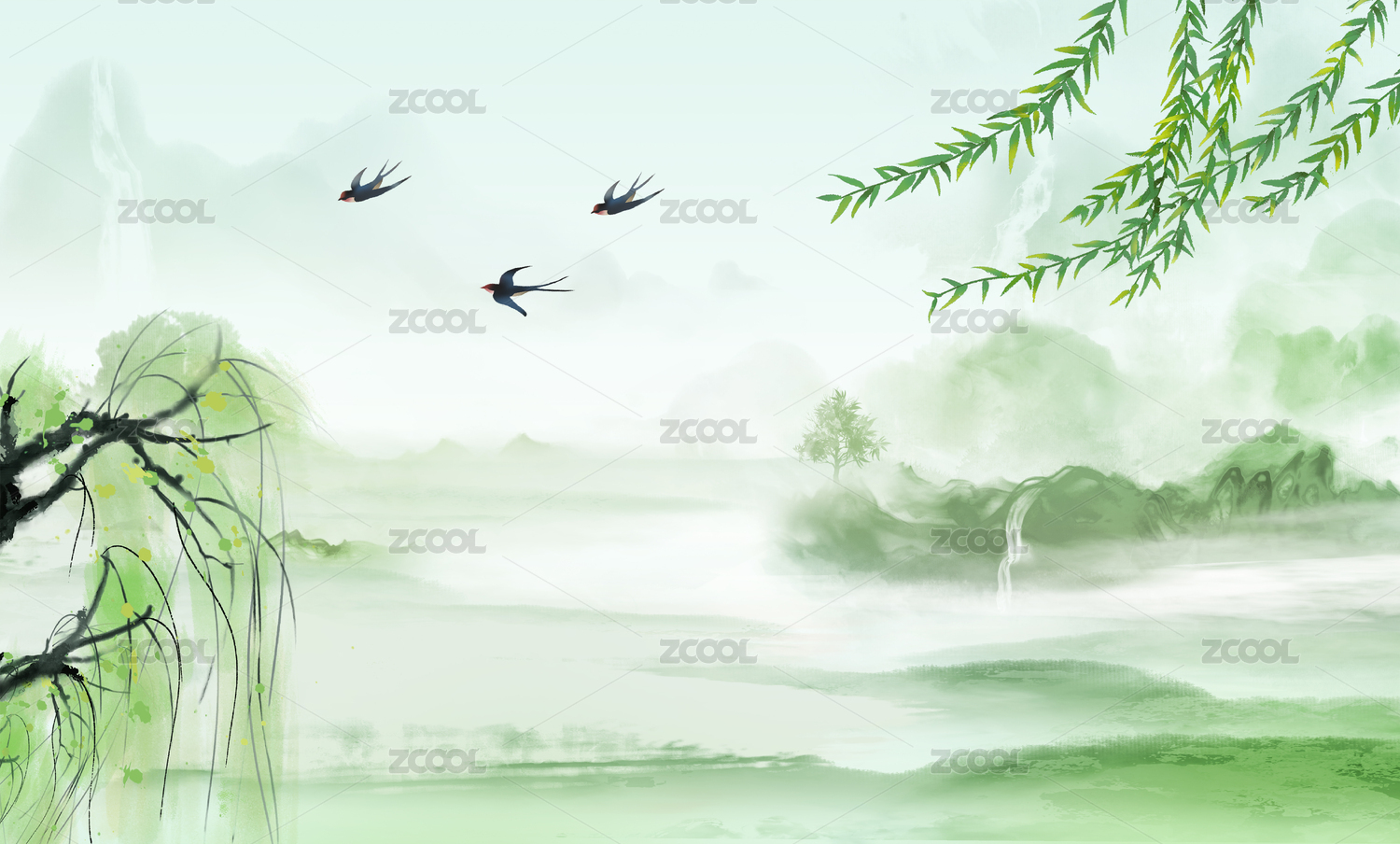中国风,山水画,春天,清明节,水墨画,插画,背景,放牛娃,水墨牛,柳树