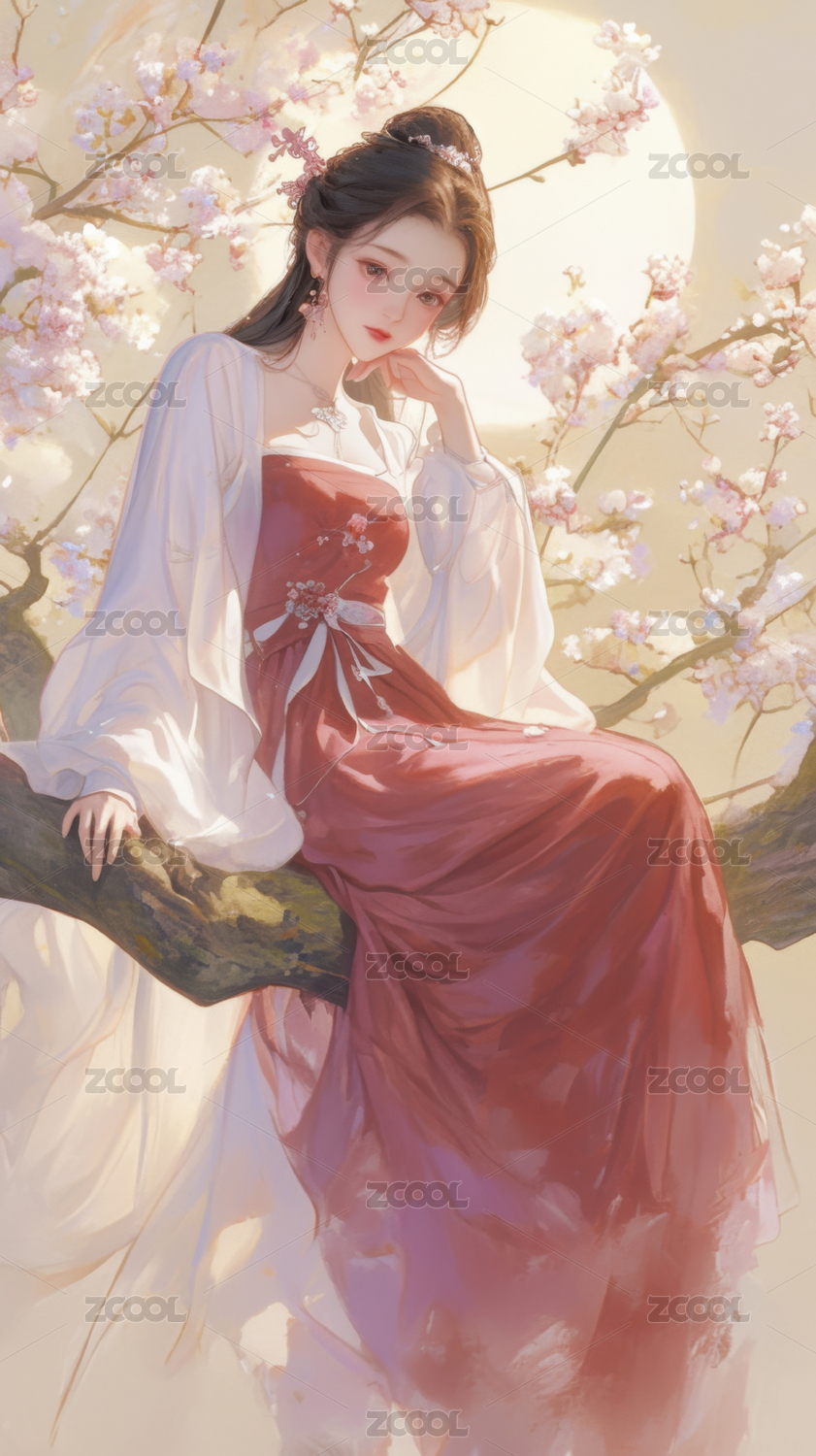 树上红衣佳人赏花月