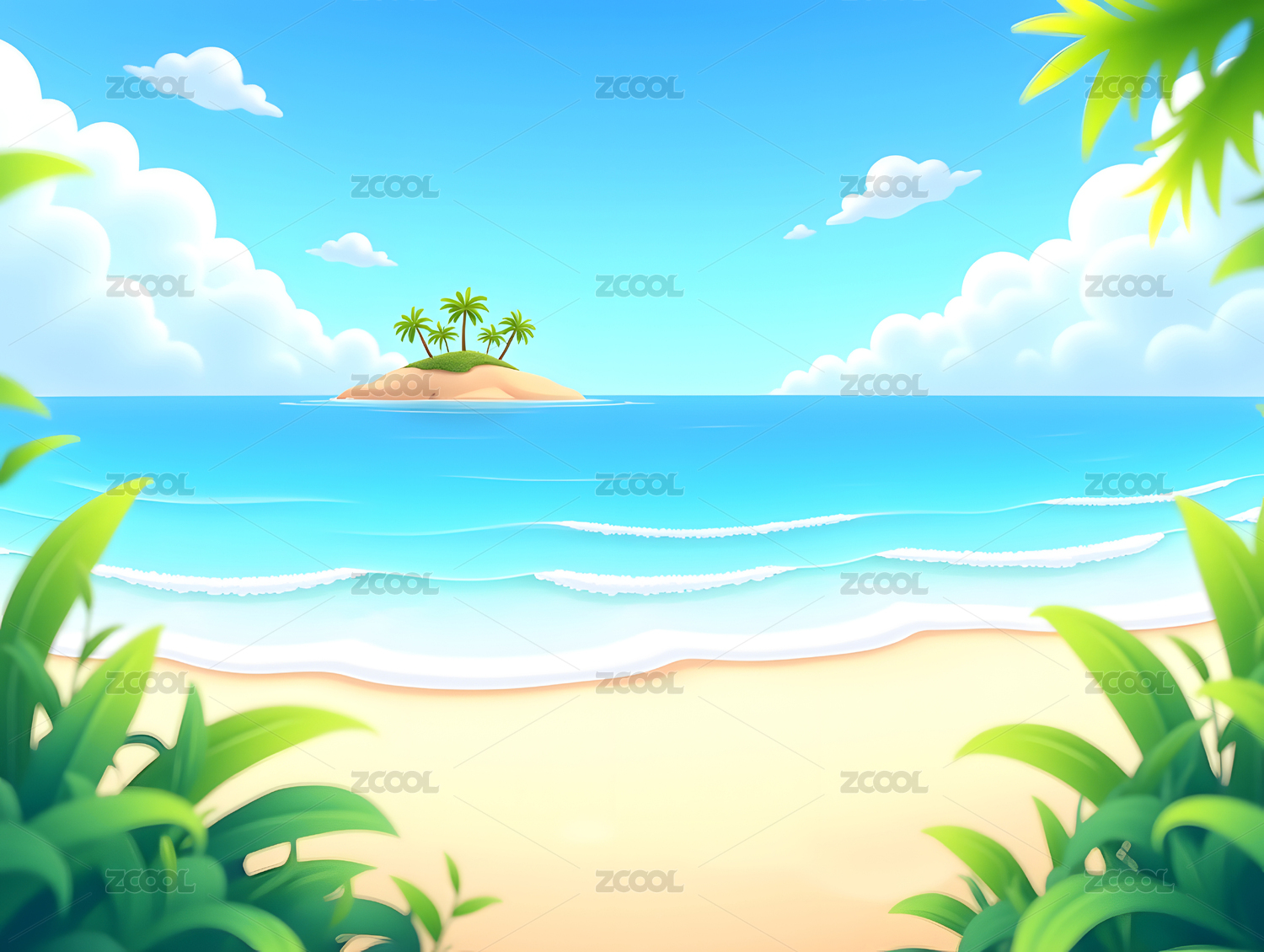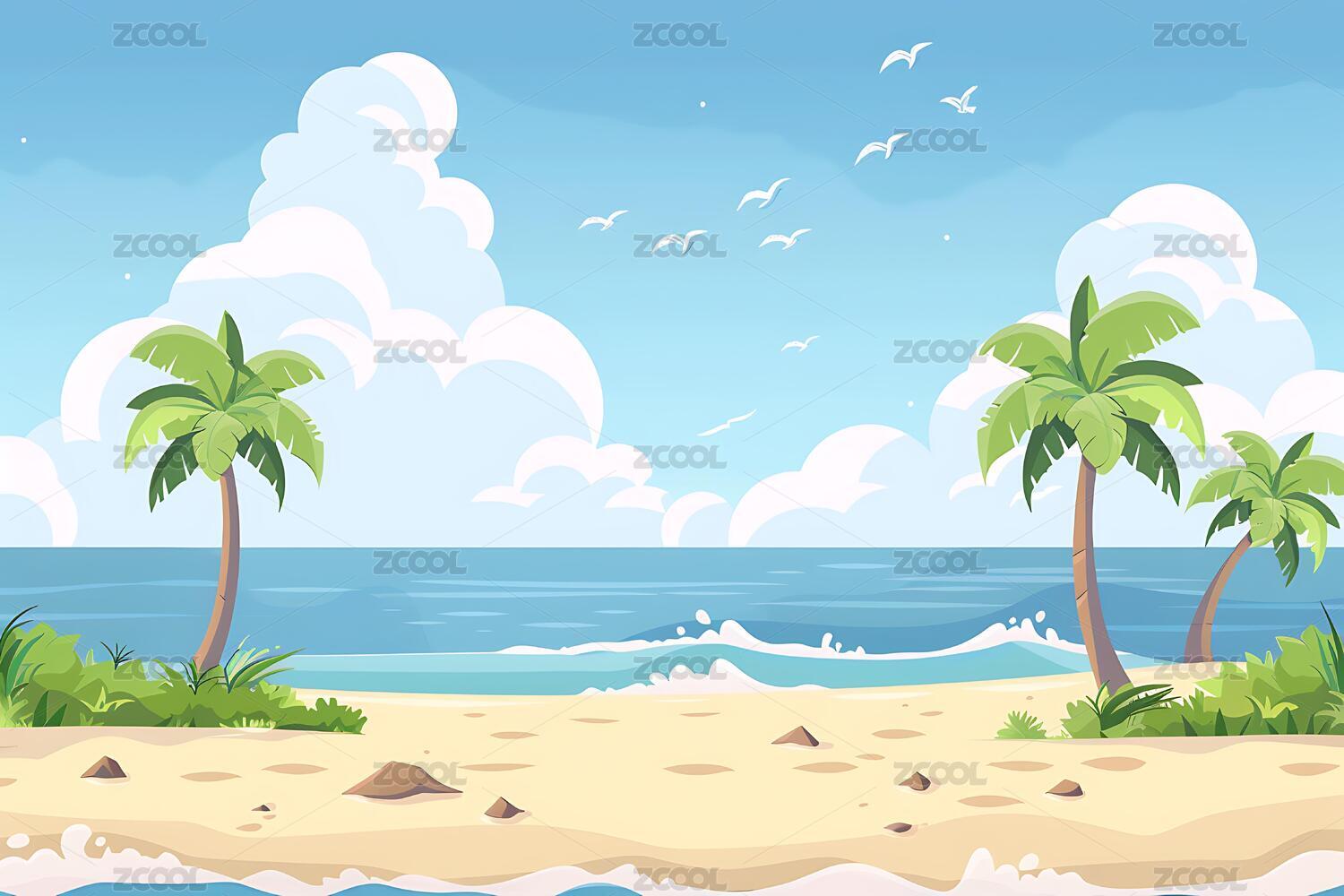 一幅描绘海滩景色的卡通插图,上面有棕榈树