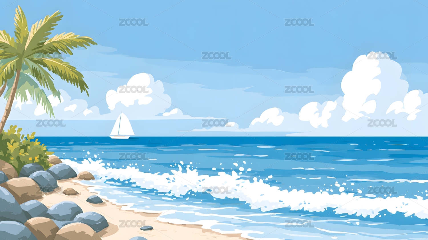 海边风景椰树帆船与浪花
