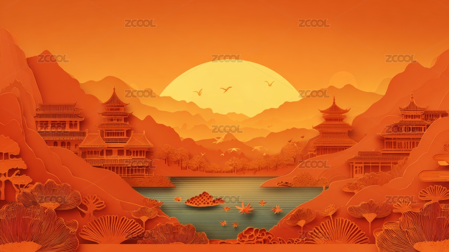 AIGC,AI数字艺术,建筑,古建,群山,山丘,简约,河流,高楼,城市
