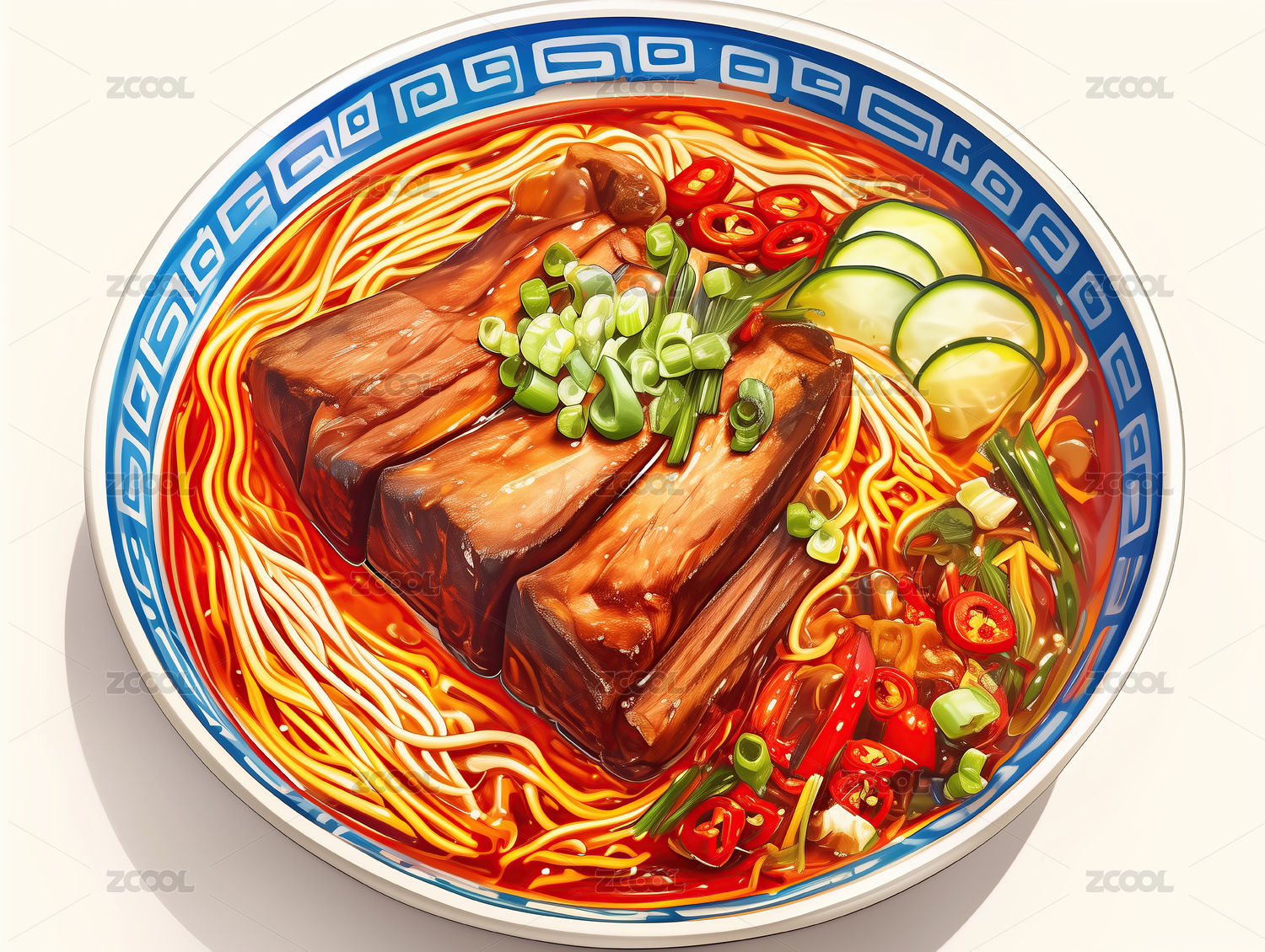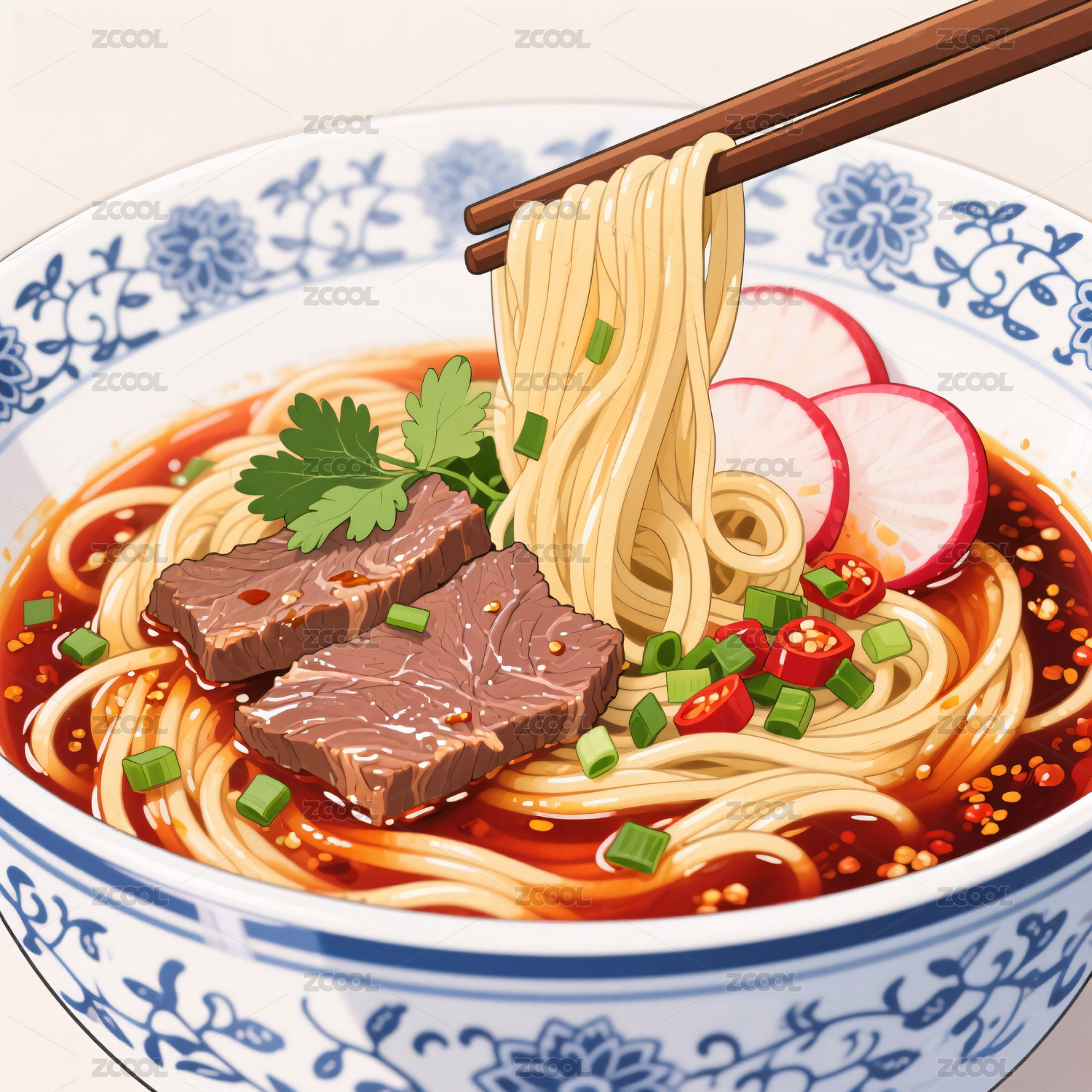 传统花纹碗装蔬菜牛肉汤面插画图案