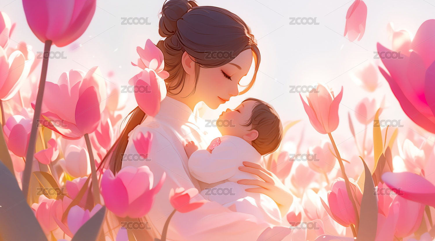 妈妈抱着婴儿粉色轻纱母婴三维插画