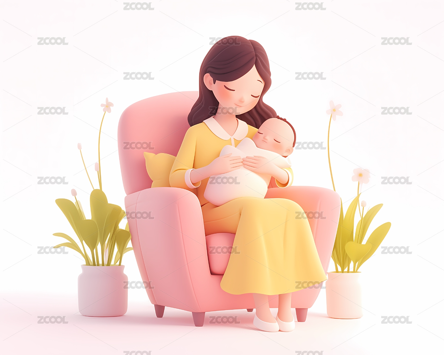 一位母亲抱着婴儿坐在粉色沙发上盆栽三维