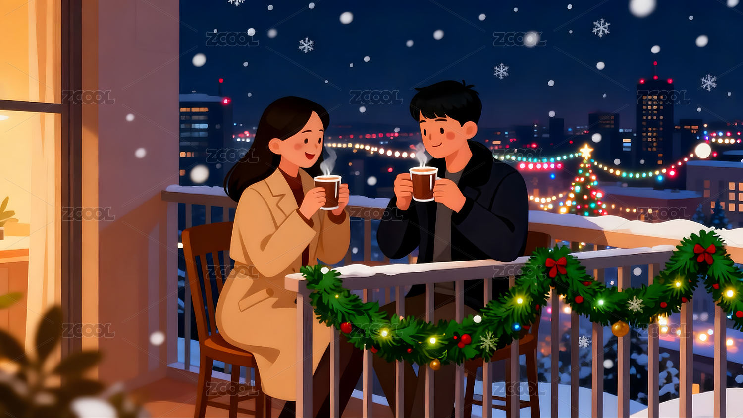 温暖,冬季,插画,冬日,男人,女人,喝茶,宠物,沙发,雪花