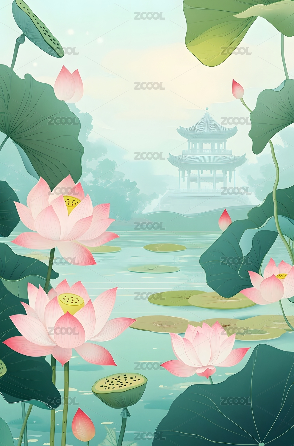 24节气插画夏天夏至池塘荷花荷叶凉亭