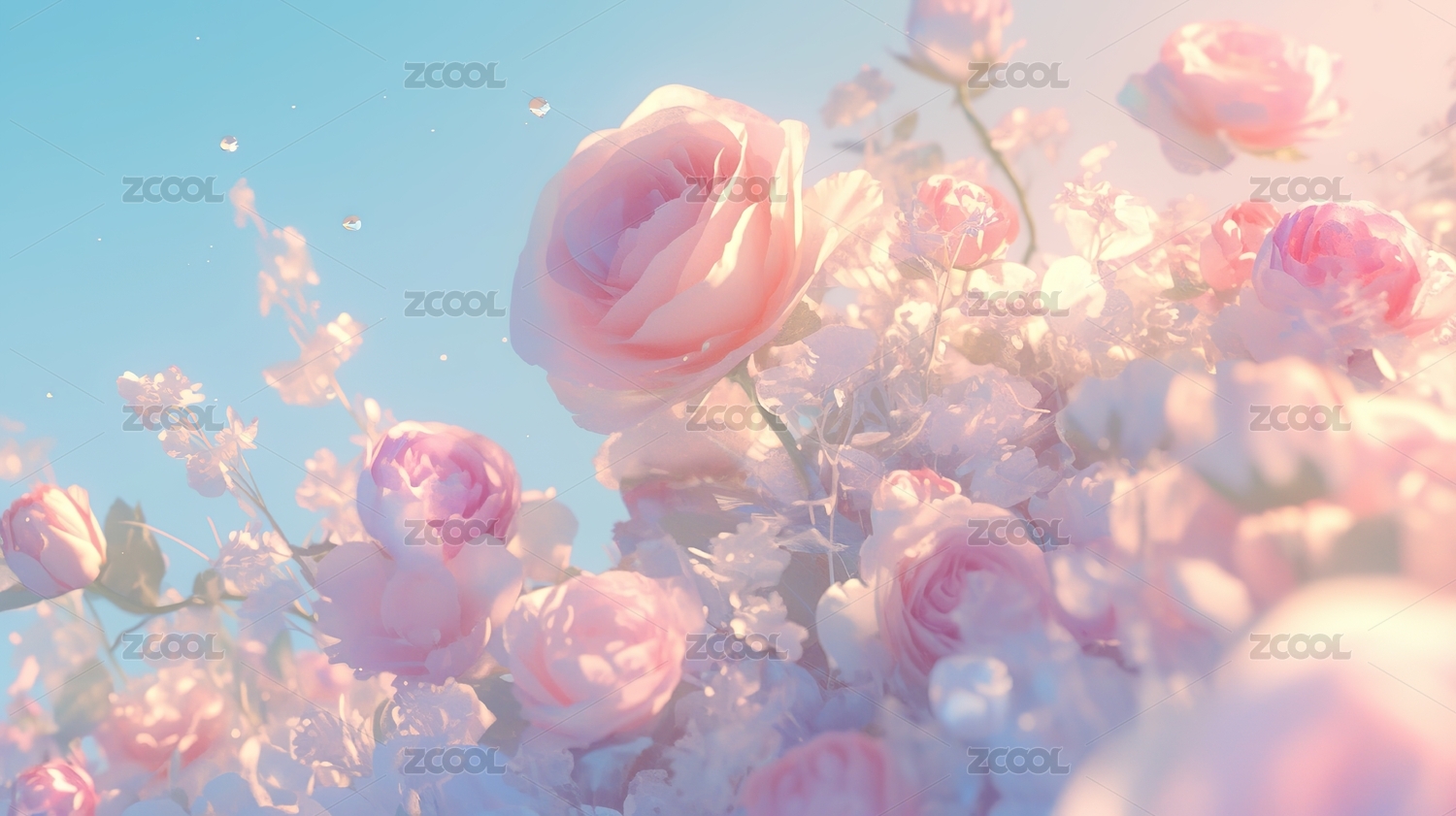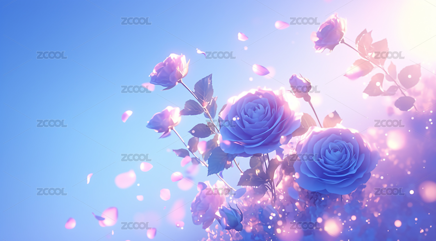 梦幻蓝背景中的粉玫瑰花