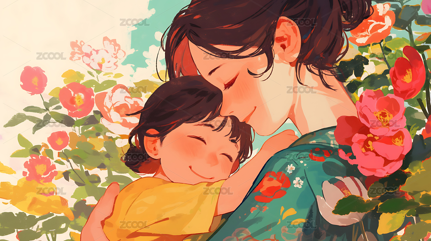 母亲怀抱着小孩鲜花环绕母亲节温馨插画