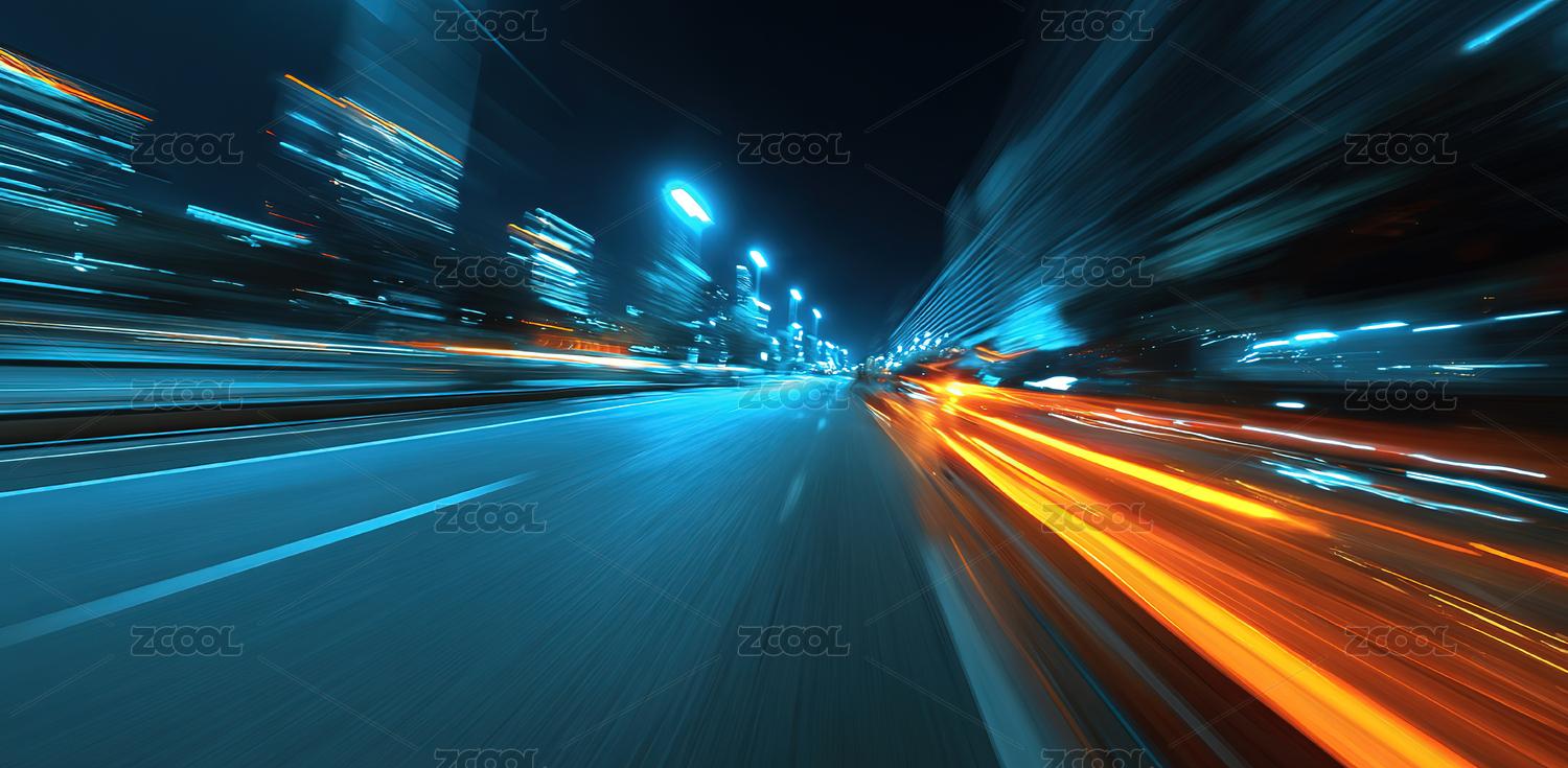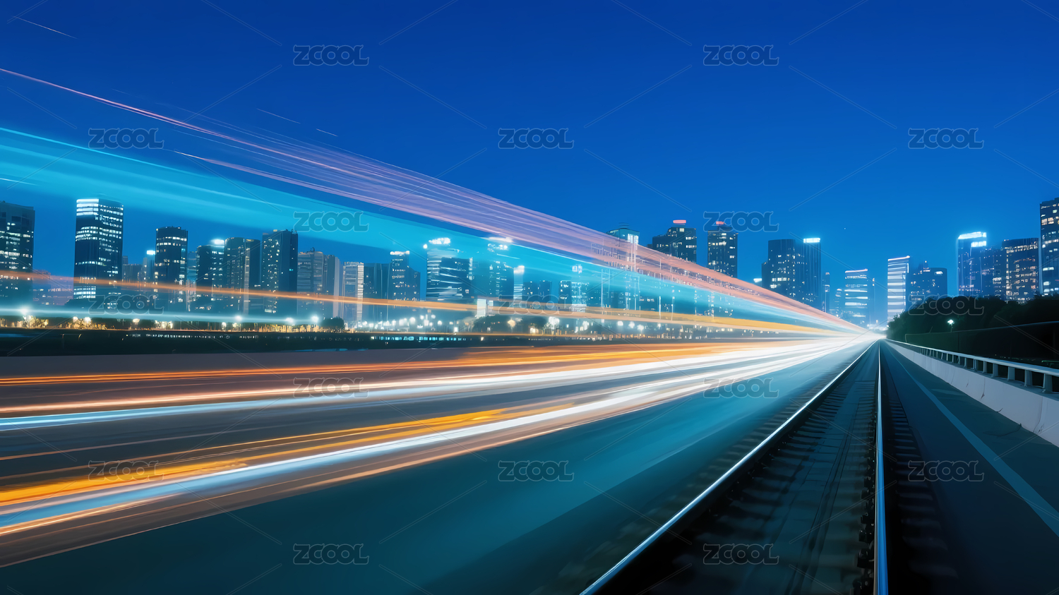 城市建筑夜景风光,飞驰的汽车尾灯形成的光的轨迹