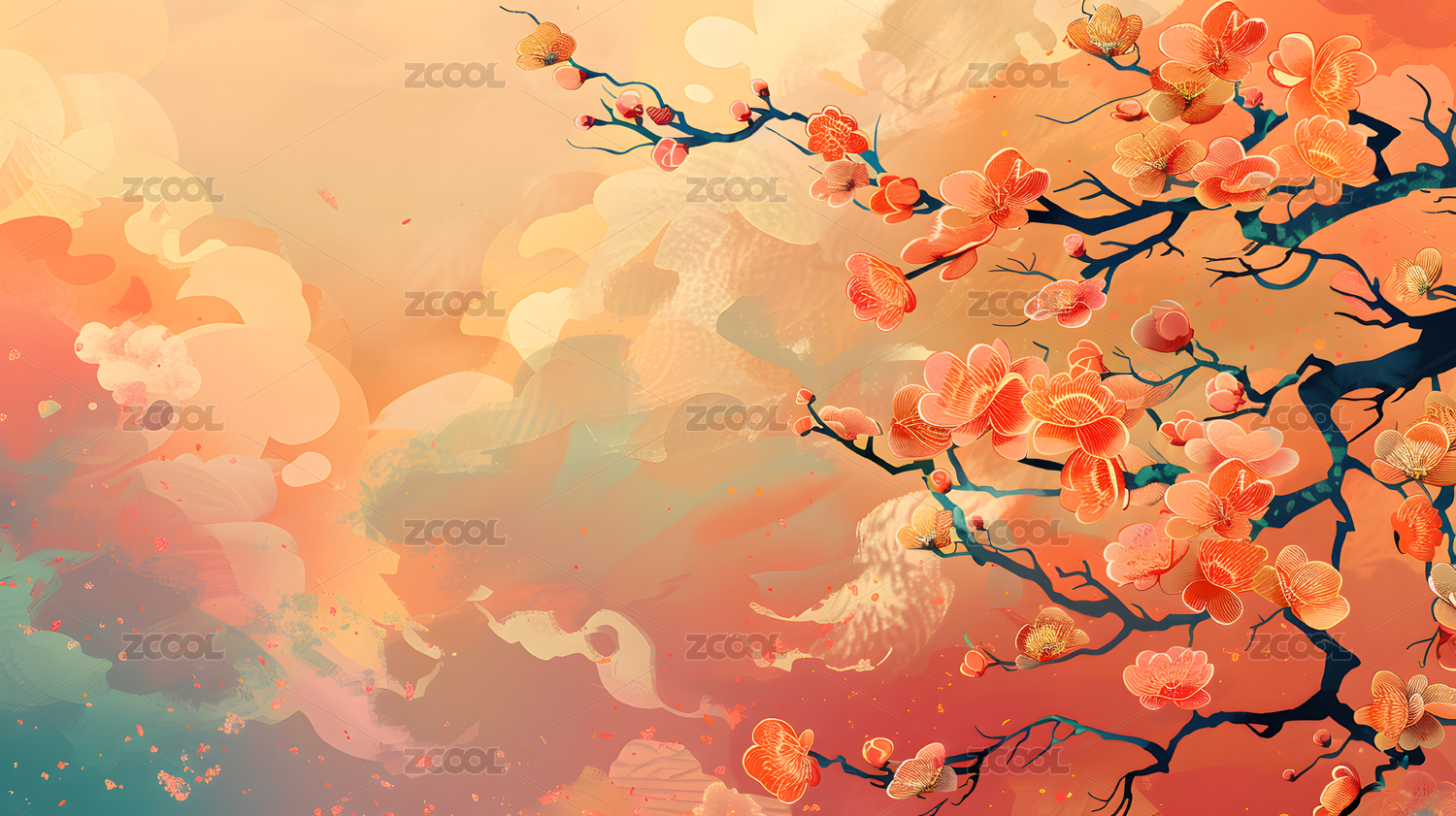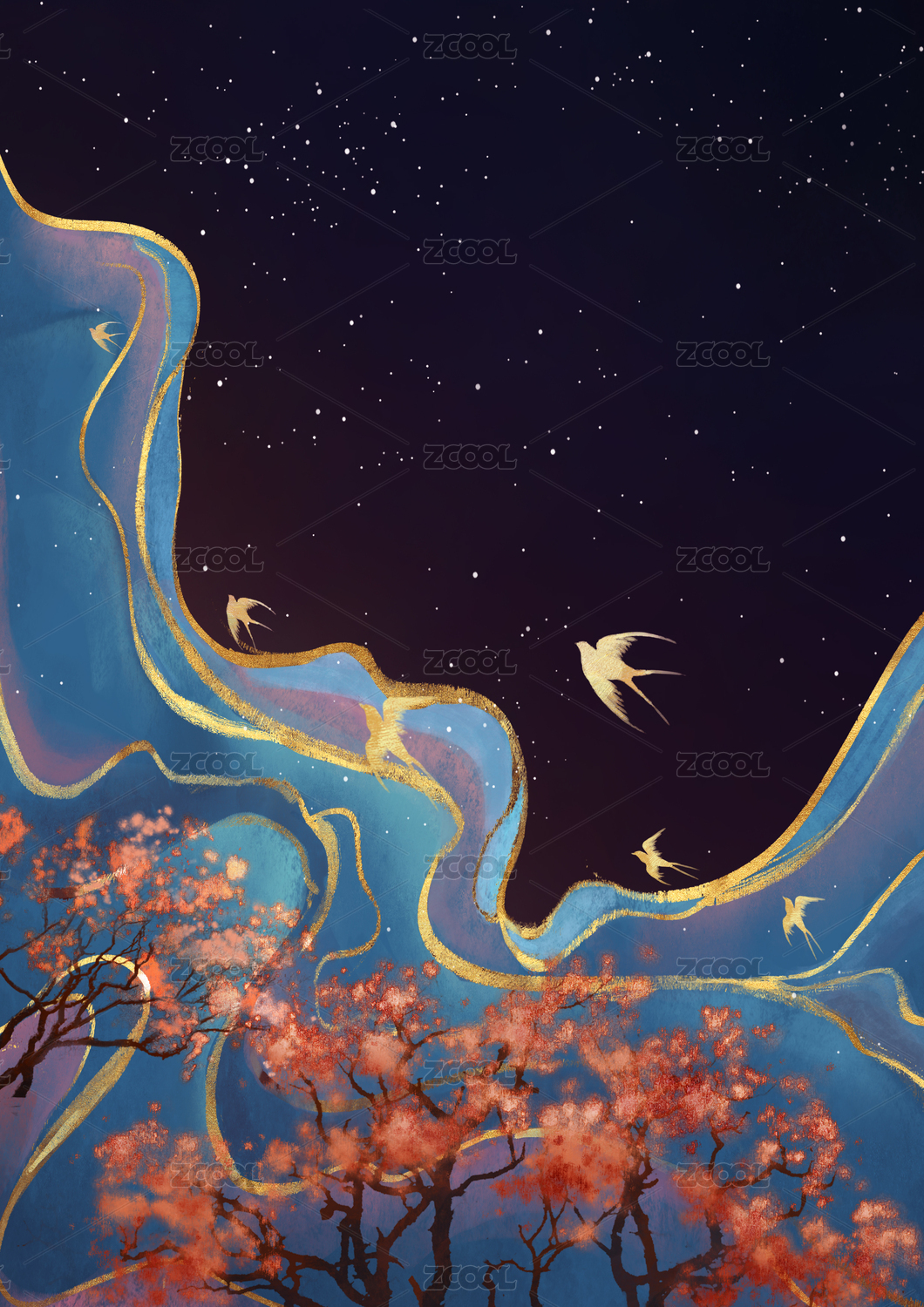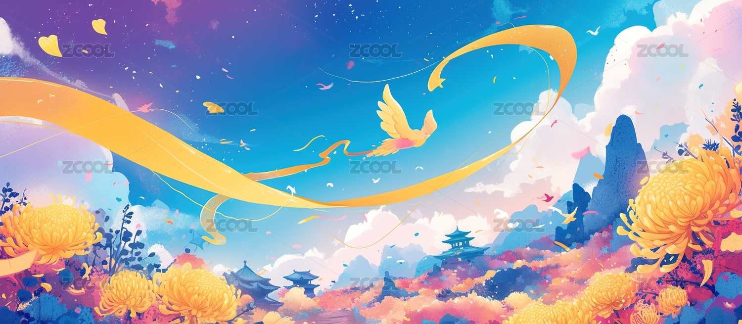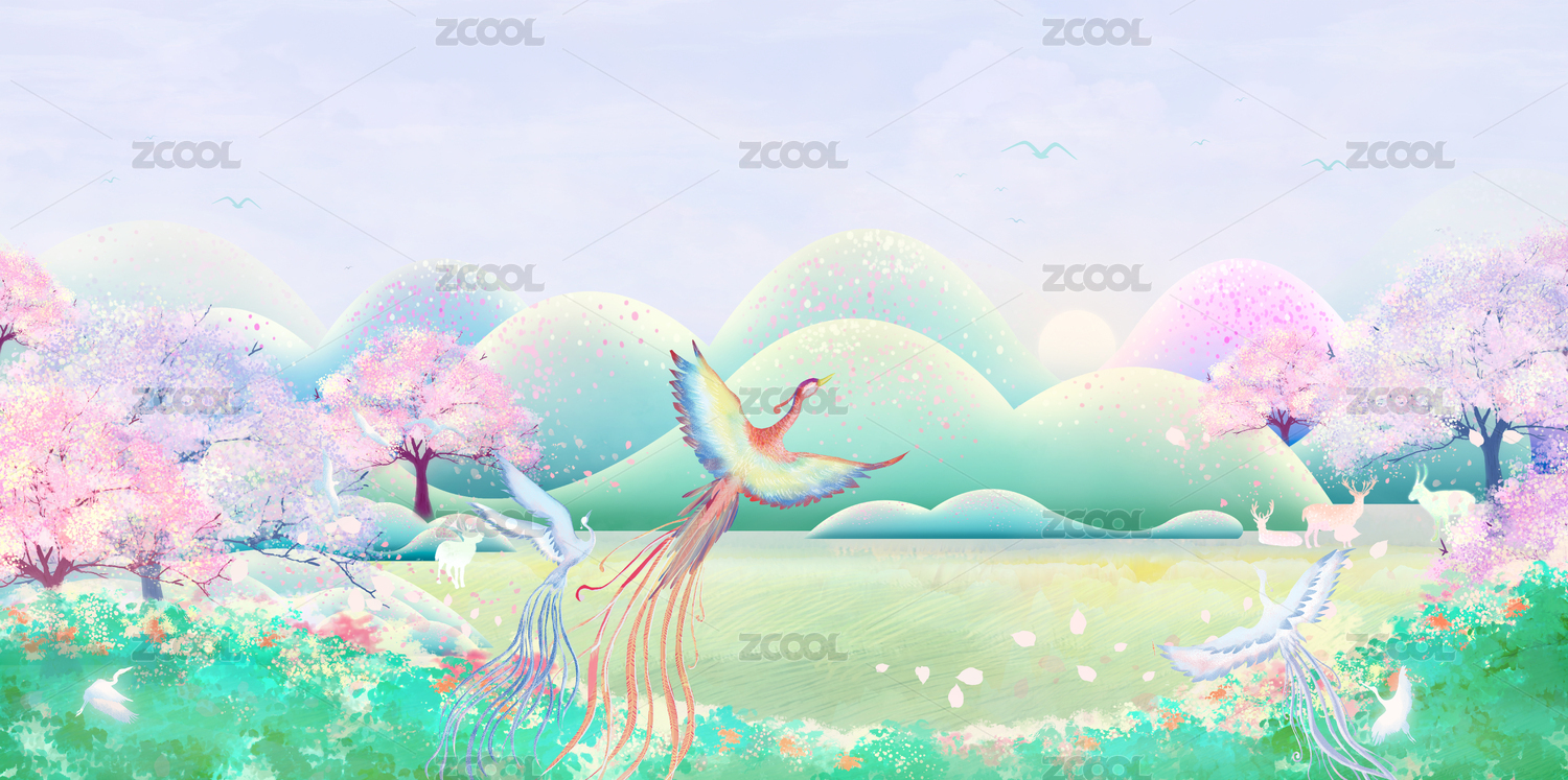 春天太阳照耀森林,小鸟飞舞鲜花盛开插画背景