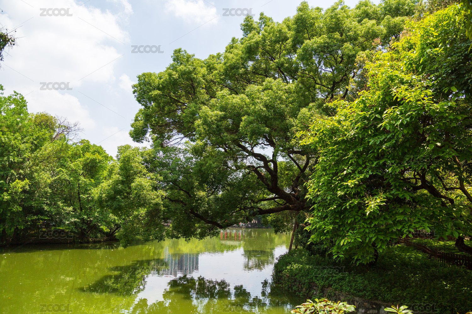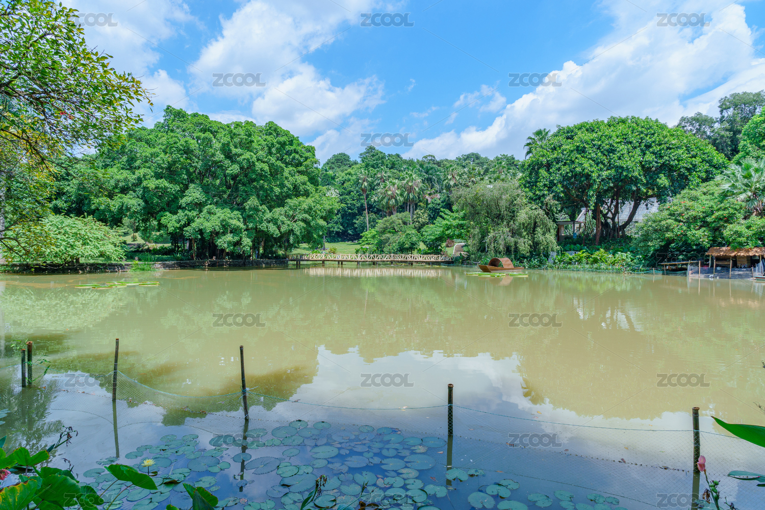 南宁狮山公园湖泊荷叶莲花与蓝天白云