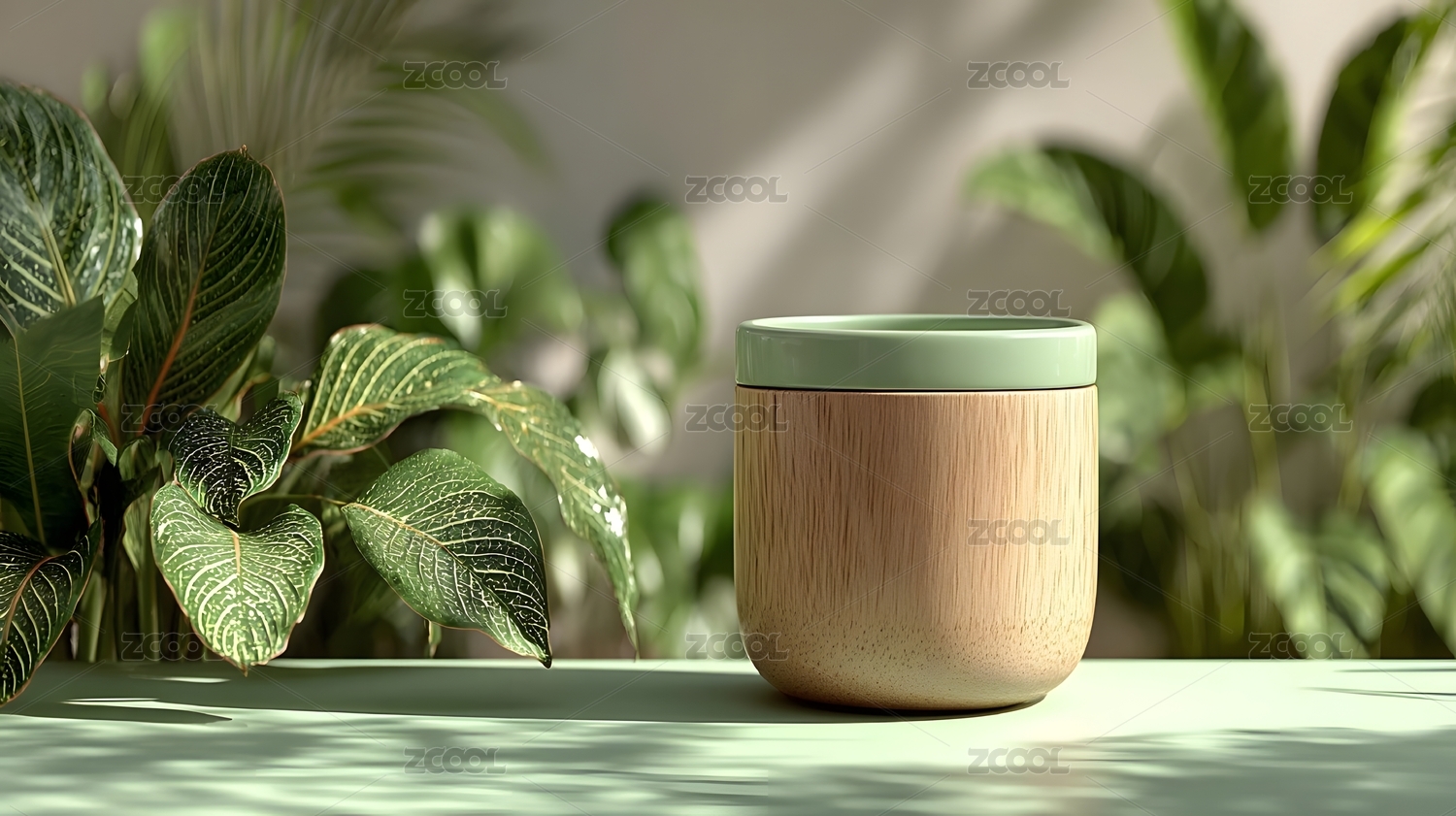 橙色木纹杯置于粉色背景与蓝紫色植物旁
