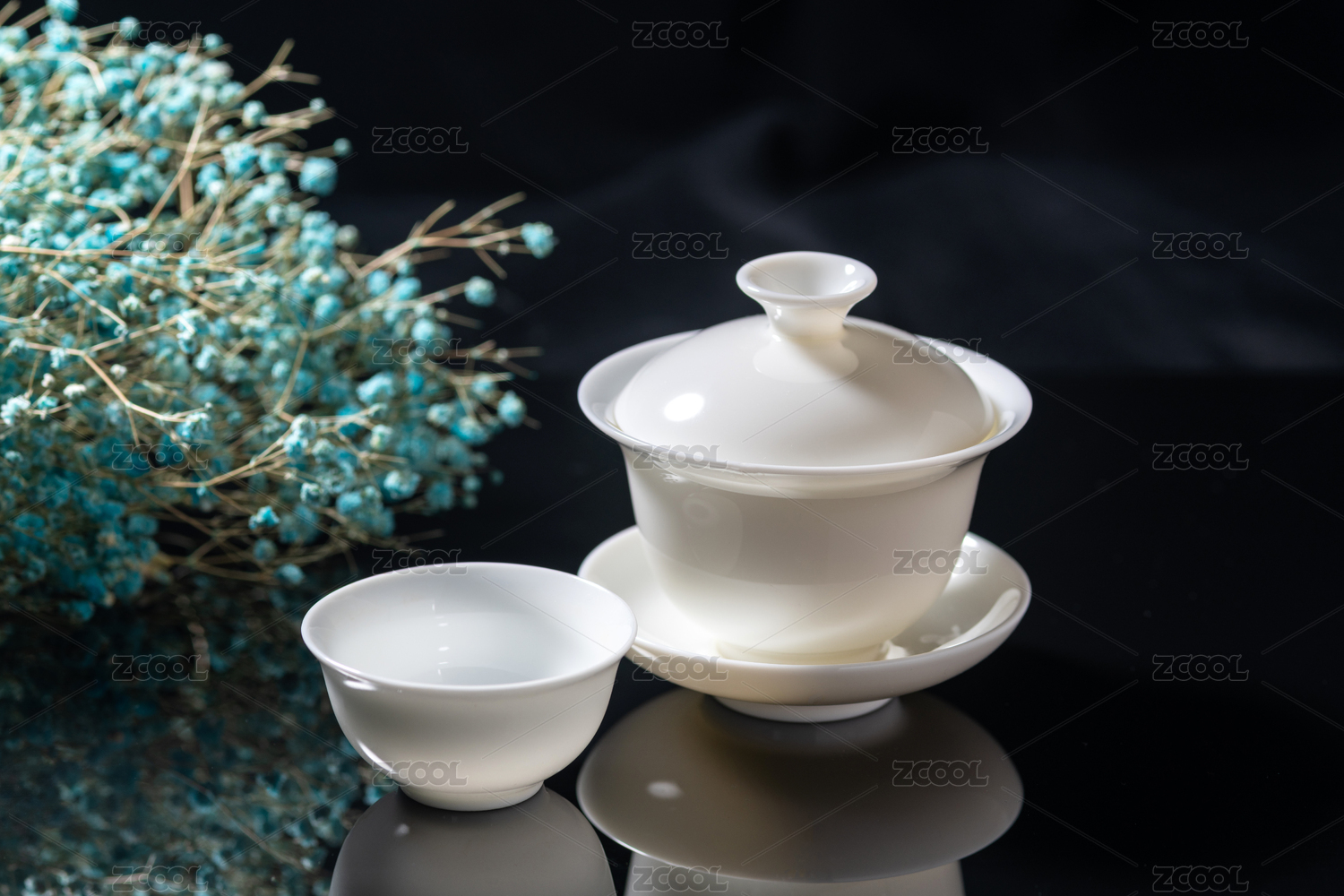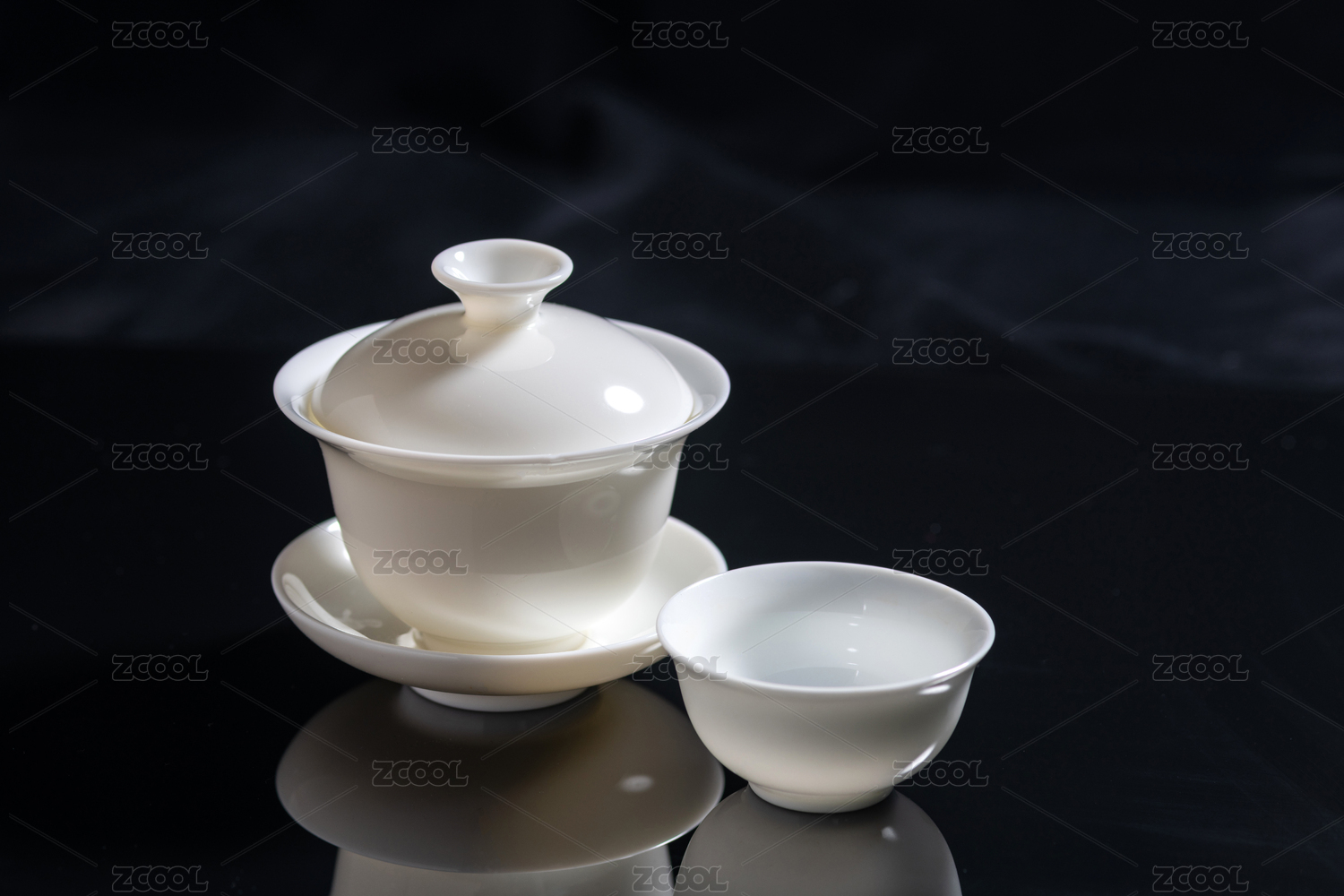 白色中国画纹样的瓷器盖碗茶杯在黑色木质桌面上特写镜头