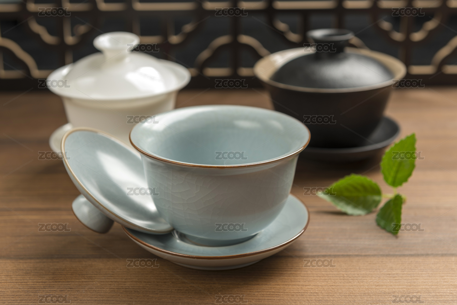 传统茶具三才杯盖碗特写木桌面古窗棂背景