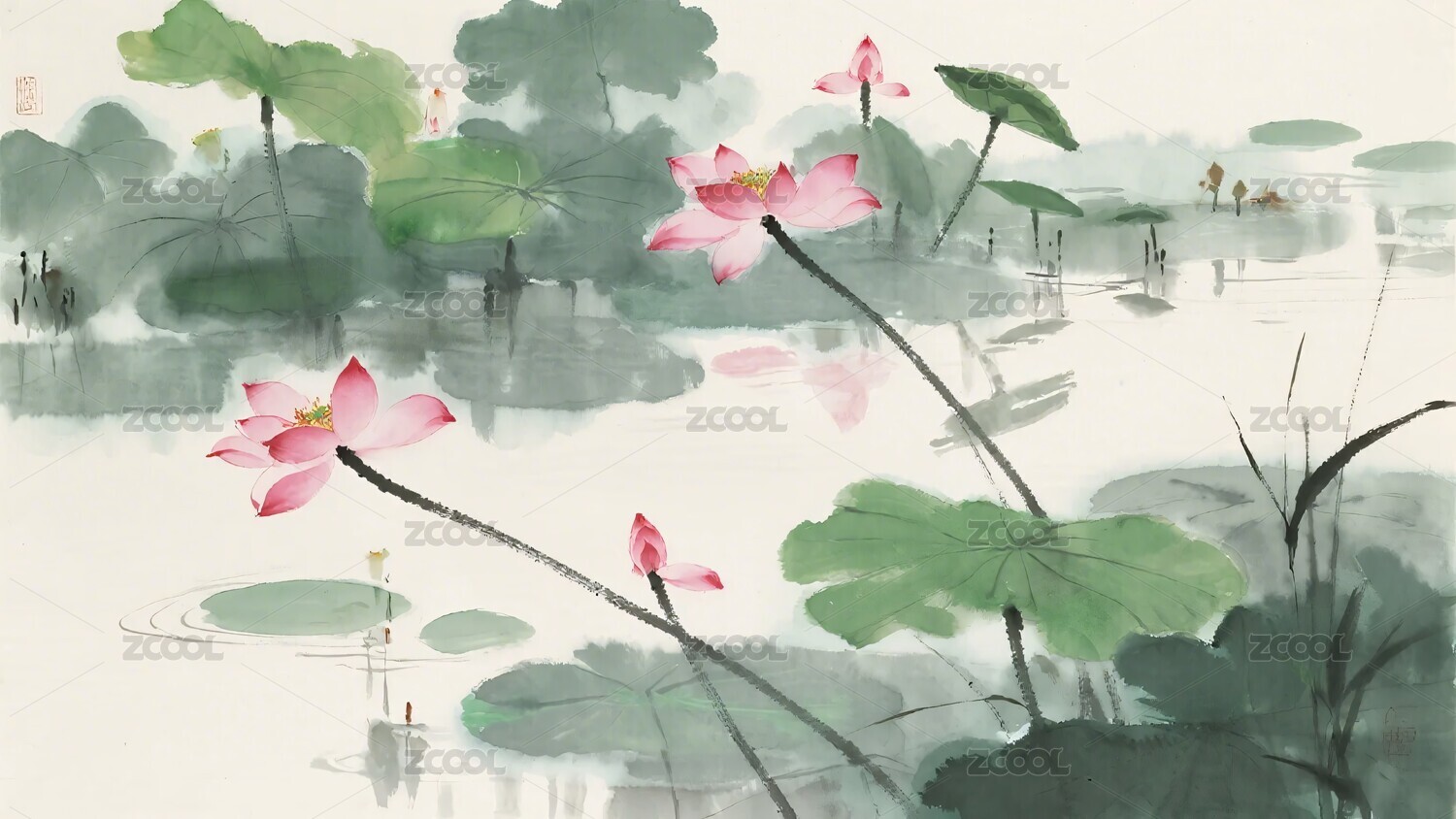 荷花水墨国风花卉场景