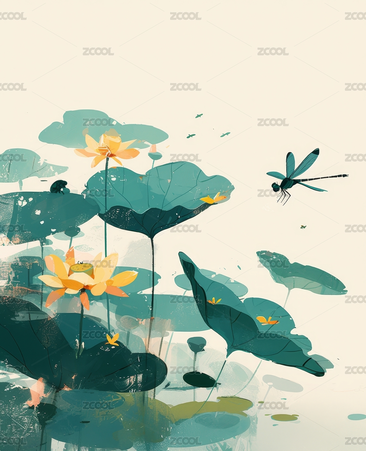 荷花荷叶池塘蜻蜓中国风插画