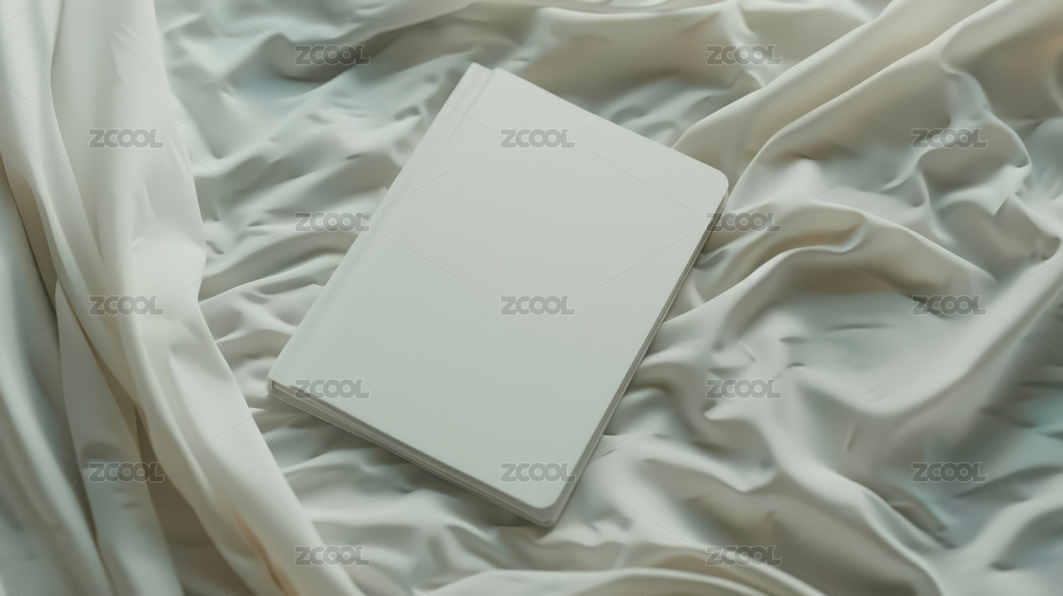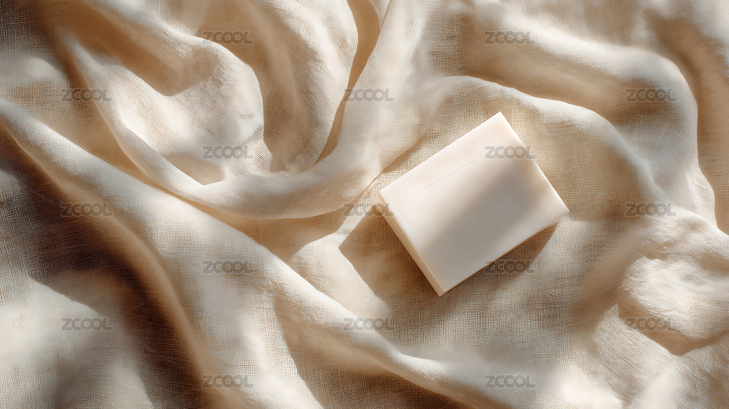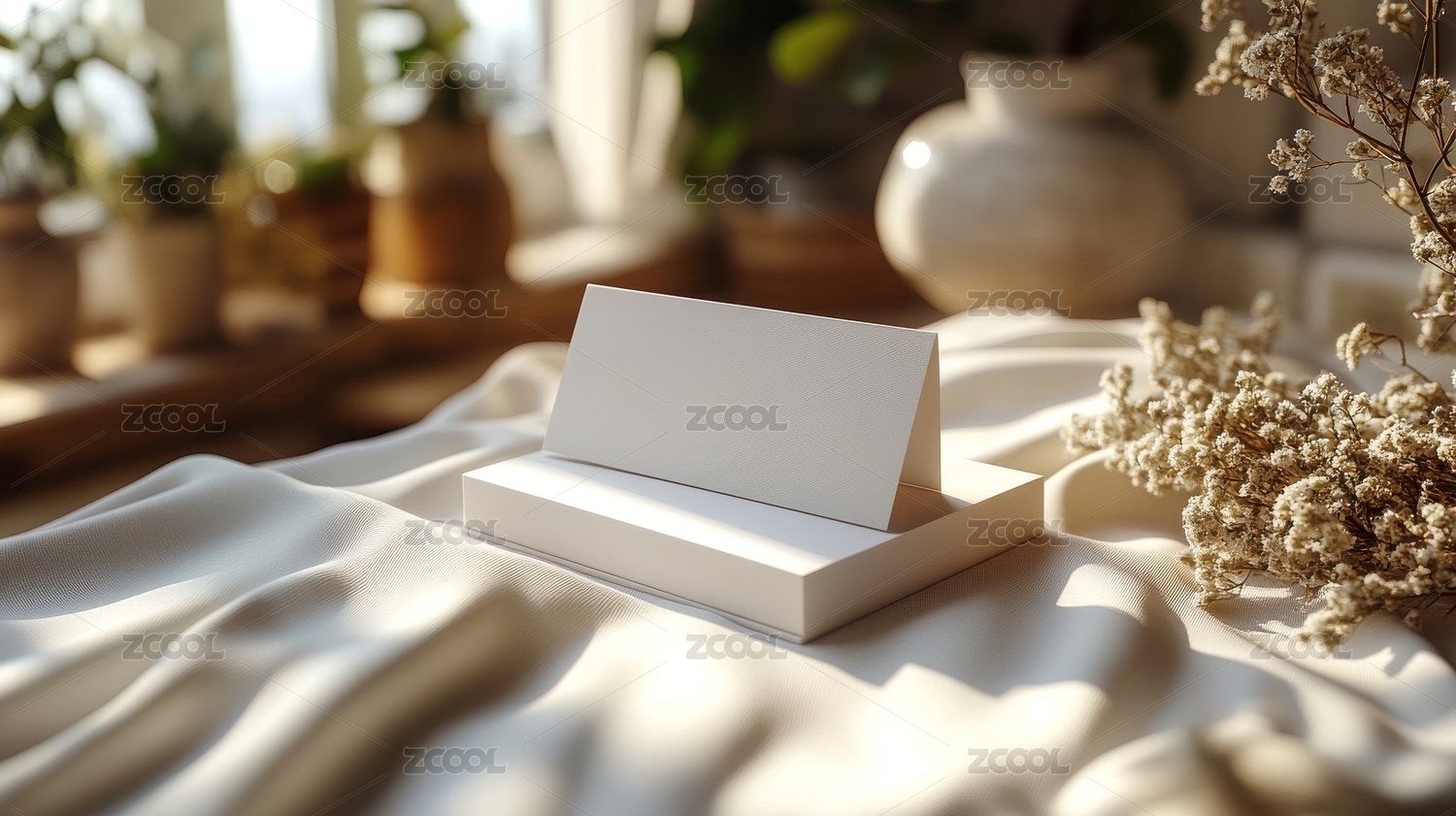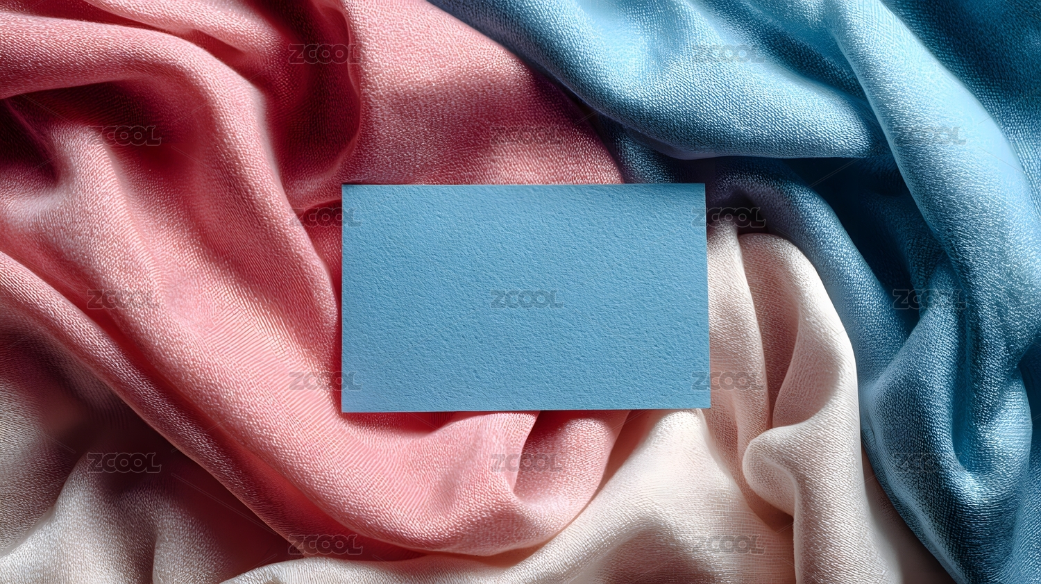 浅蓝色布料上的白色卡片静物摄影高清图片