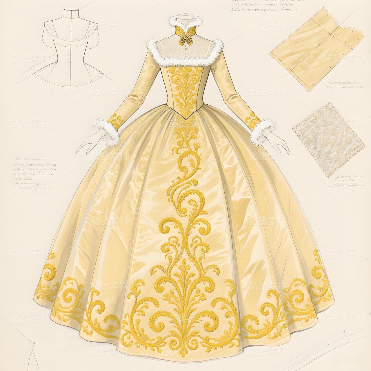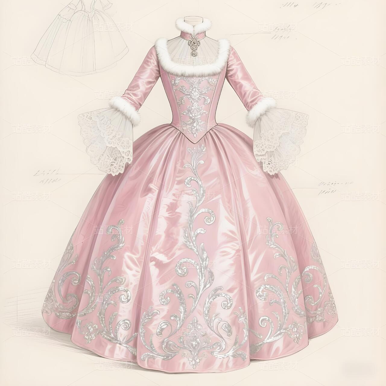 欧洲洛可可卷草纹样高定礼服设计手稿