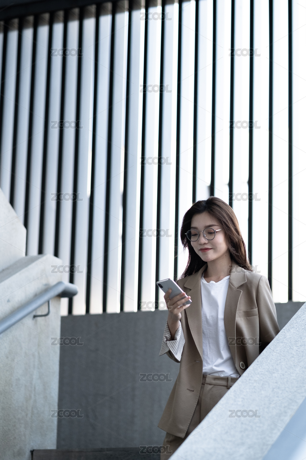 年轻时尚女士在楼梯上边看手机边下楼梯