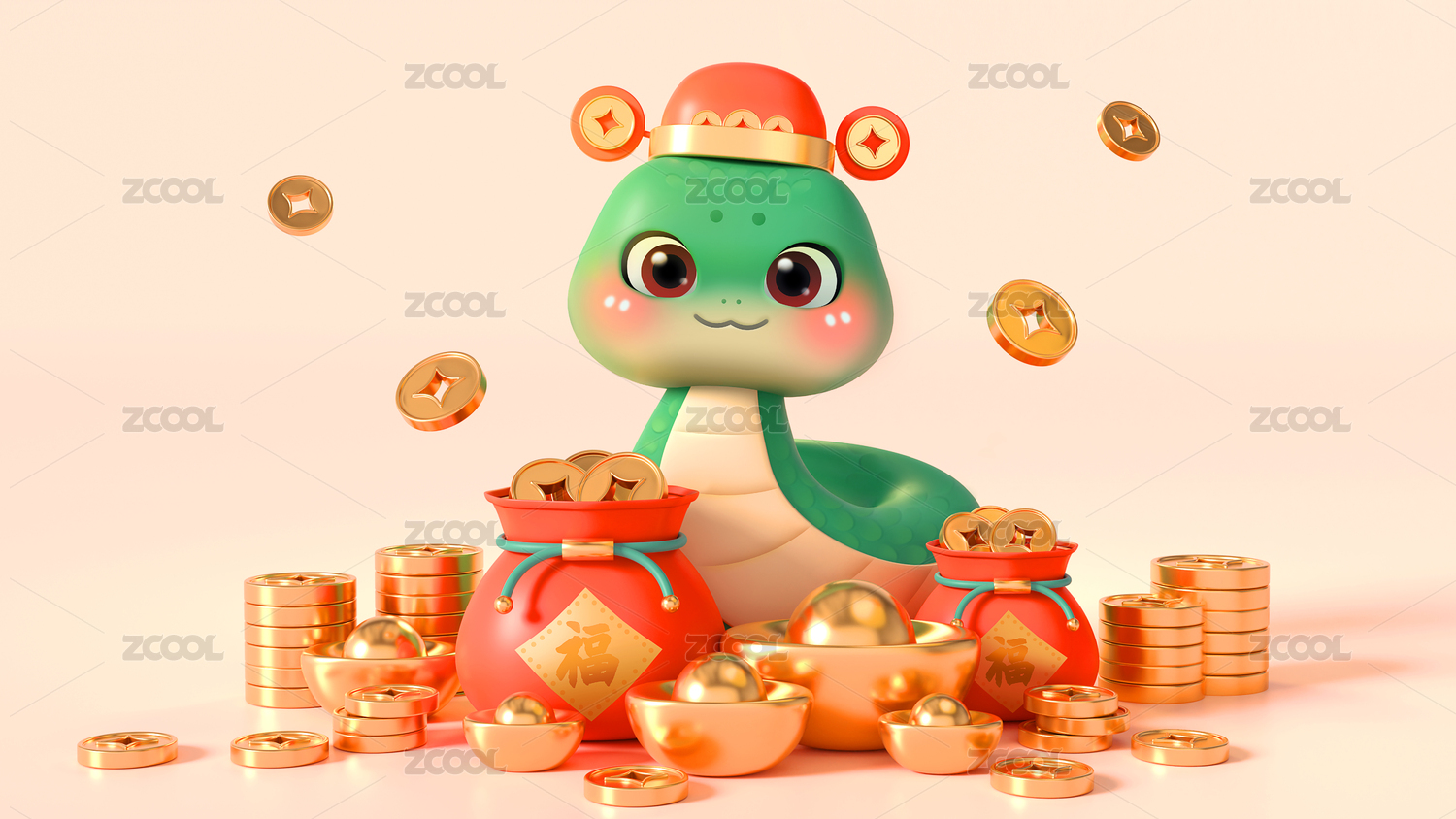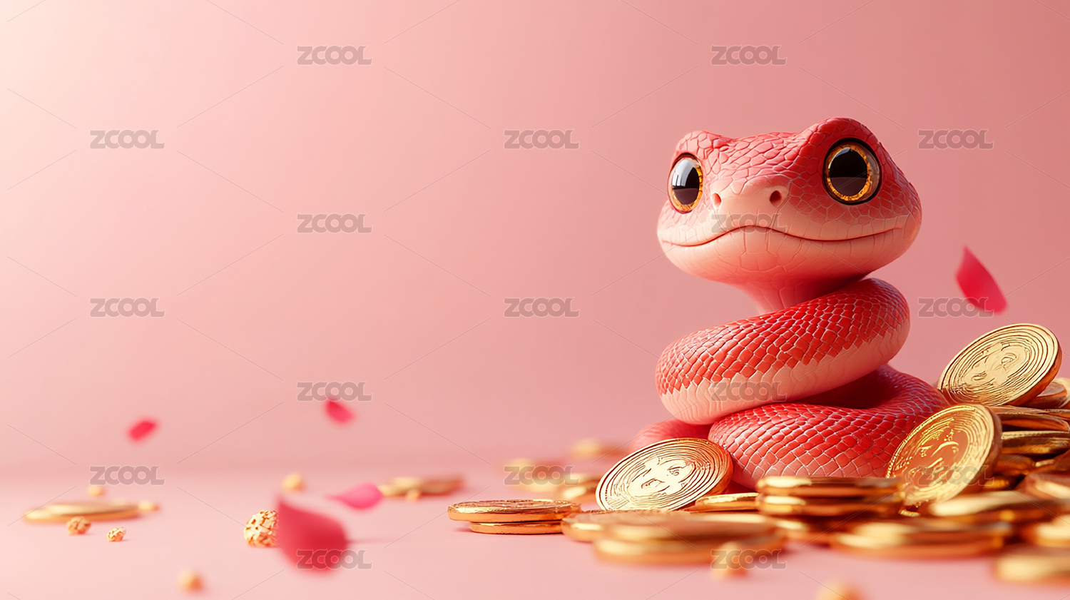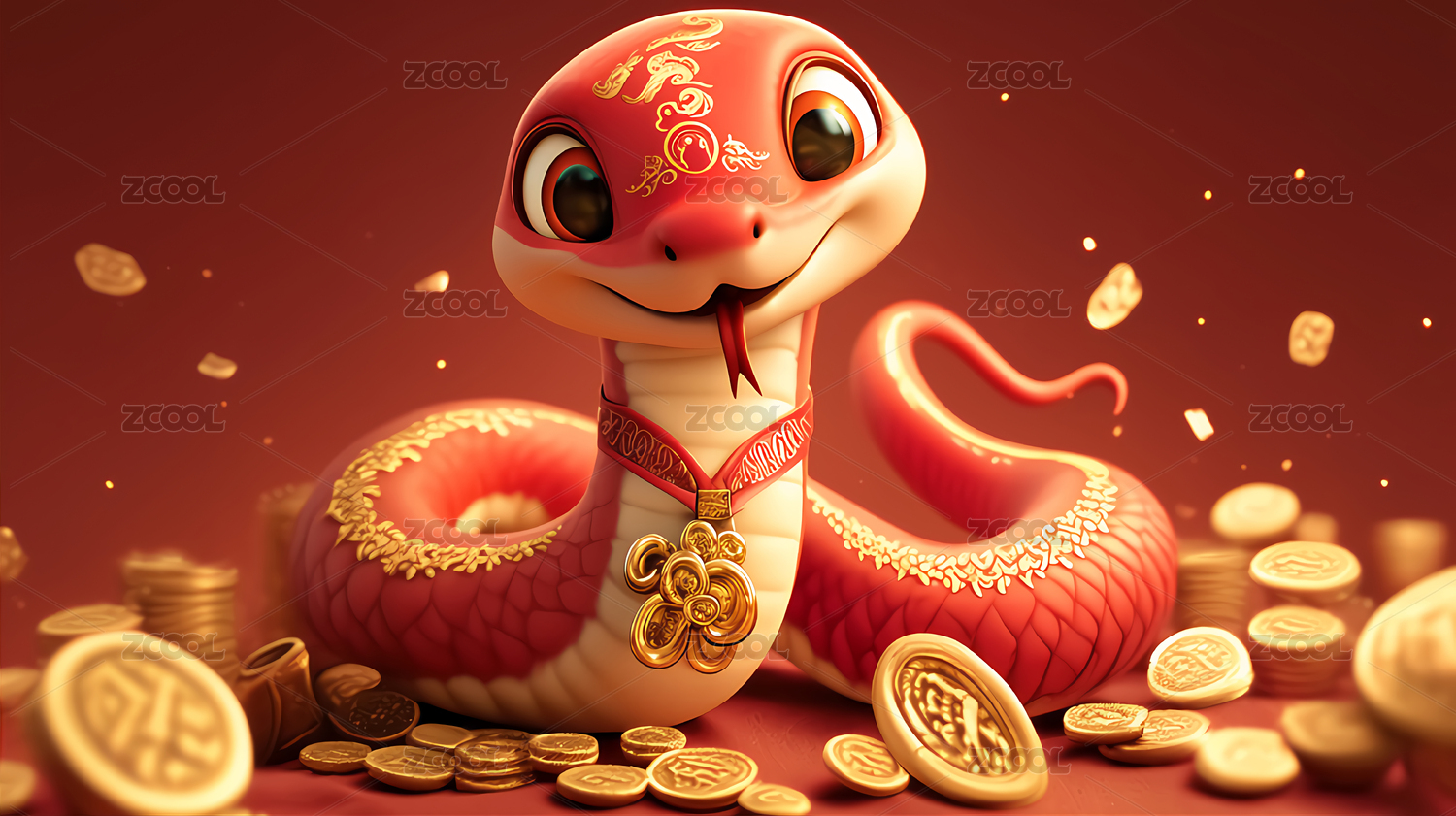 三维卡通小蛇金币与红色节日背景插画