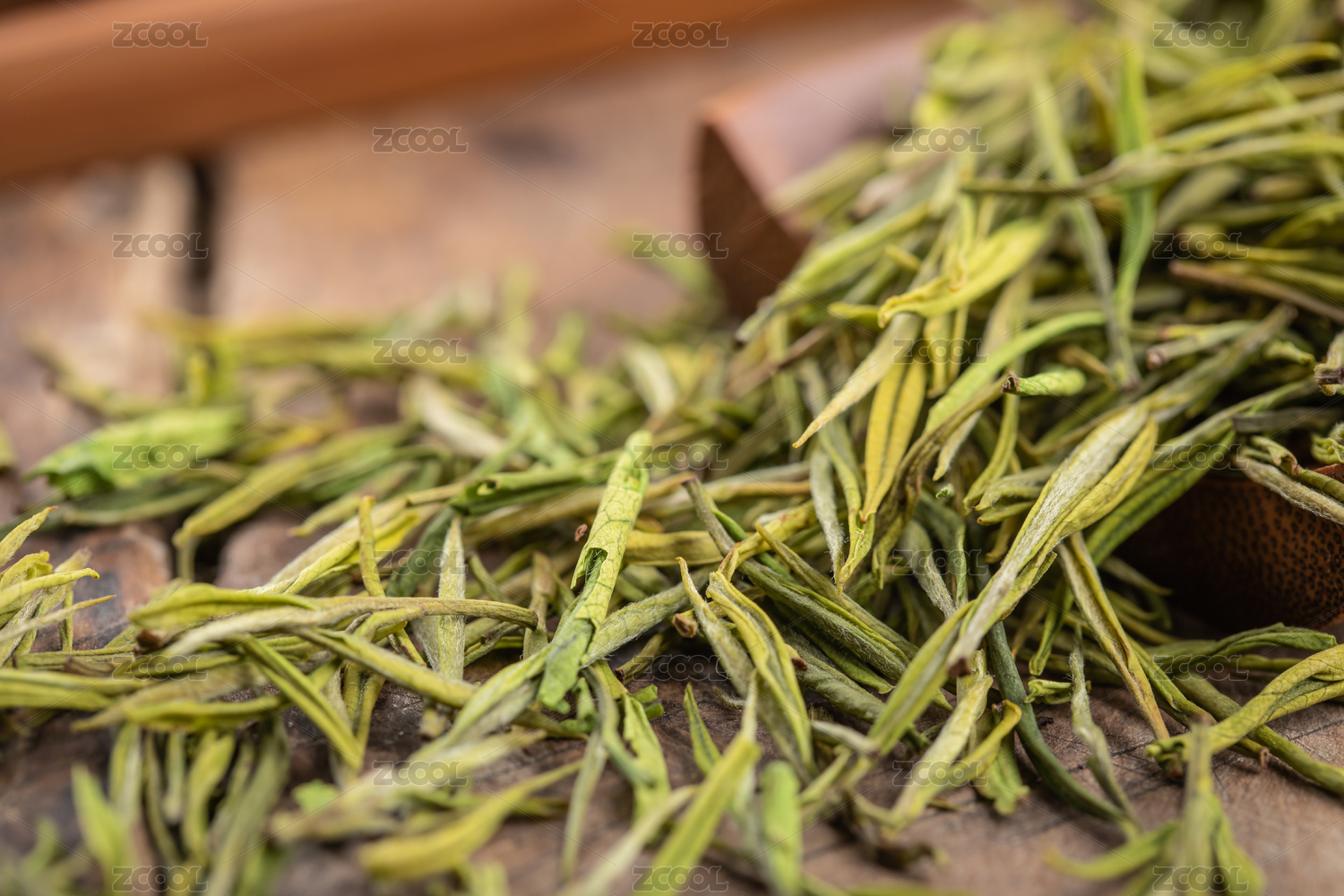 木质背景上的安吉白茶茶叶与茶具