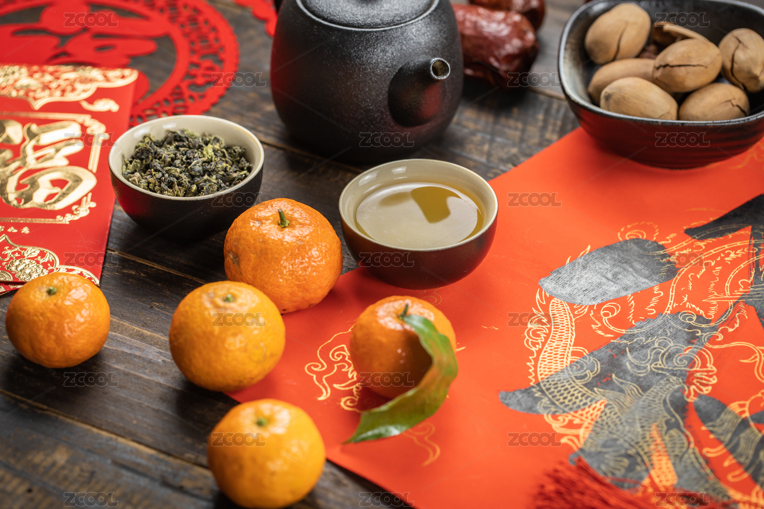 摆着红色背景上的茶盘茶具旁边还放着装有坚果的果盘及对联红包