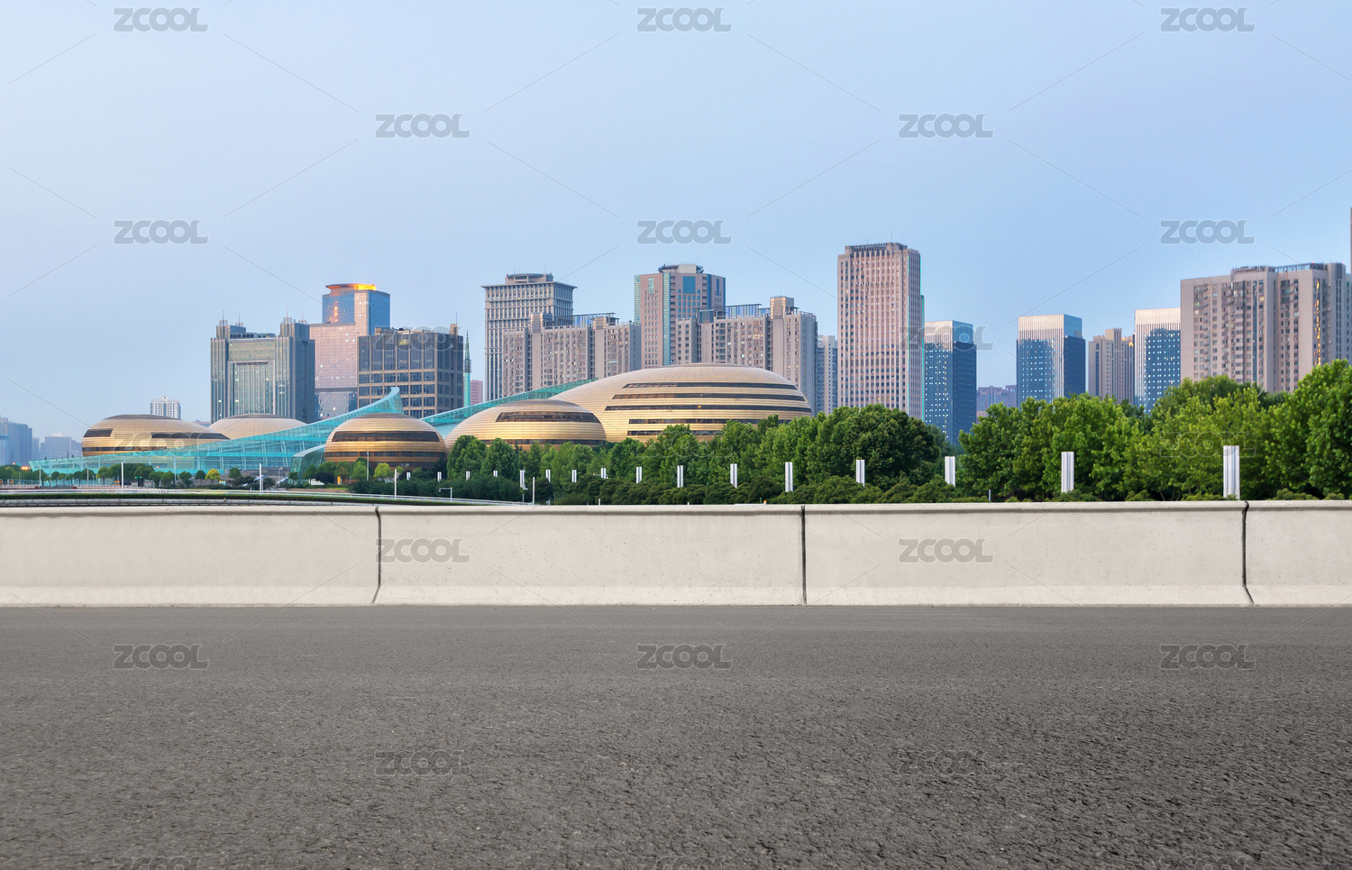 前景为沥青道路的郑州城市景观和城市天际线