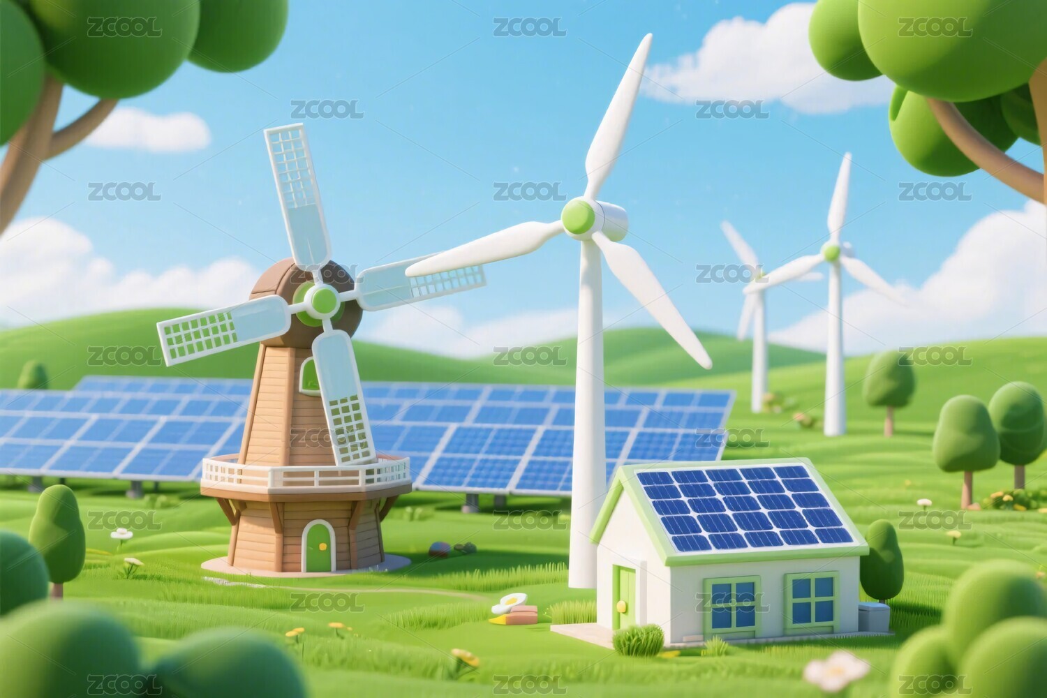 3d光伏发电和绿色新能源风车建筑房屋