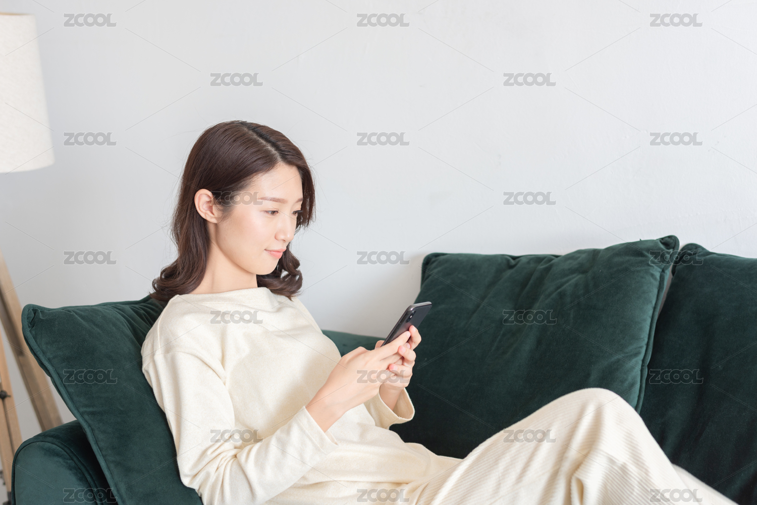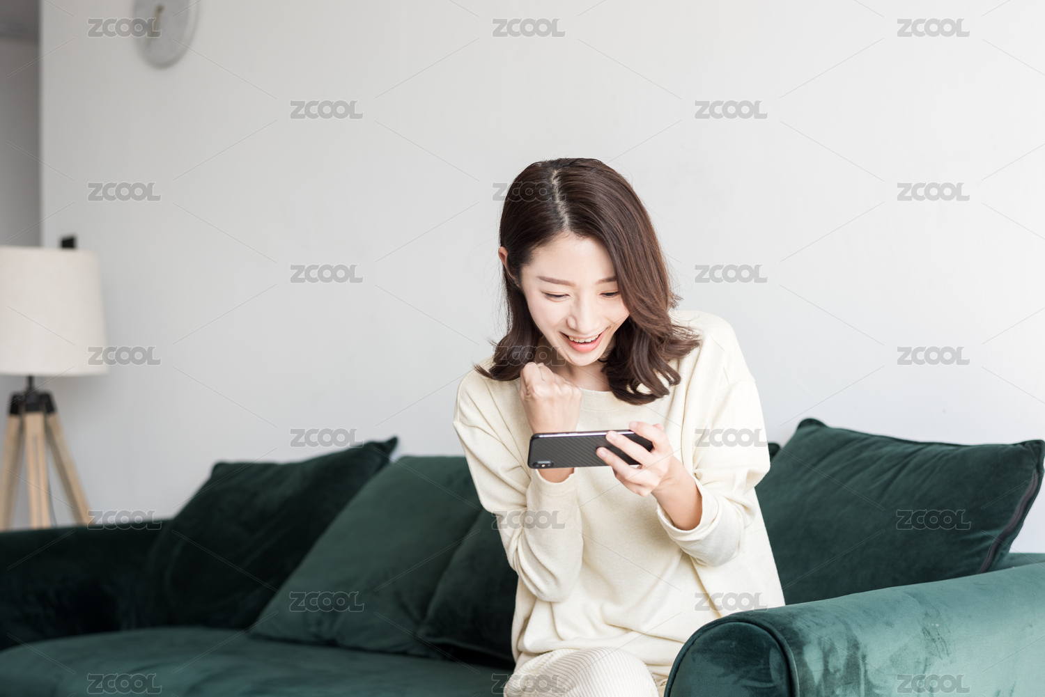 年轻漂亮的女性坐在沙发使用手机玩游戏
