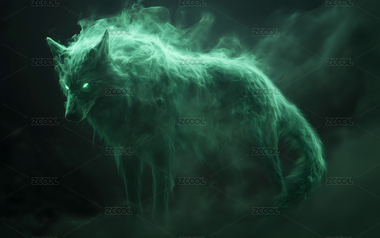 元宇宙数字成像一只散发绿色荧光的狼背景