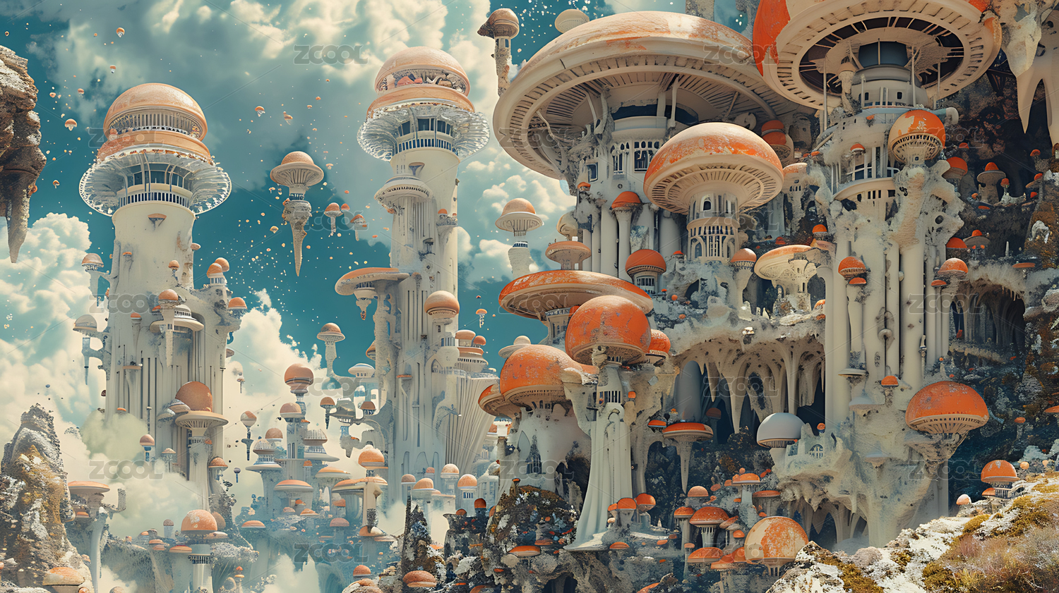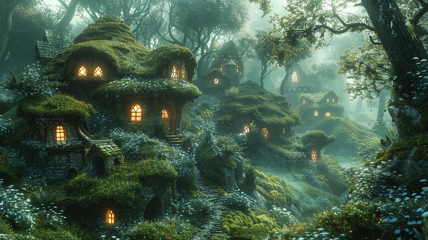 迷雾森林村庄树屋木屋奇幻超现实大场景创意