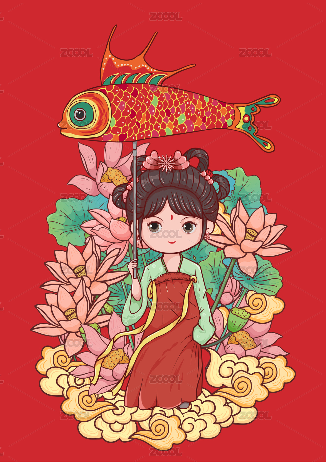 国潮风格撑着鱼灯的国风女孩线性矢量插画