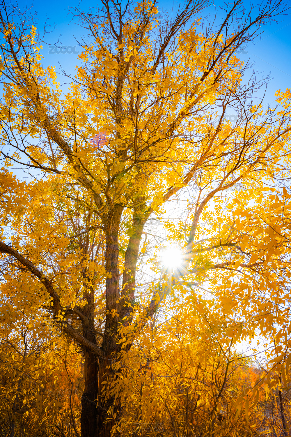 中国内蒙古自治区阿拉善盟额济纳旗秋天阳光下胡杨仰拍