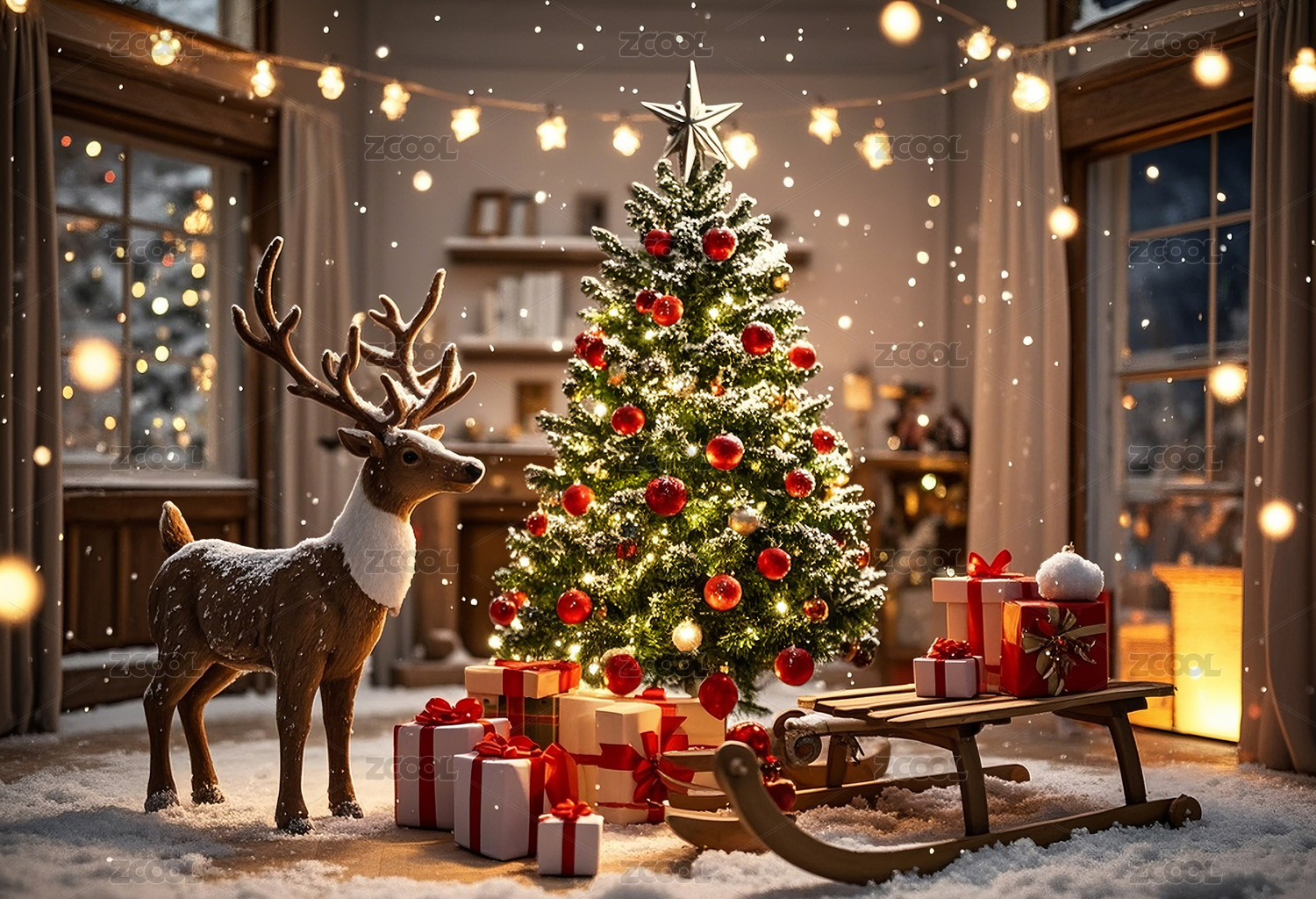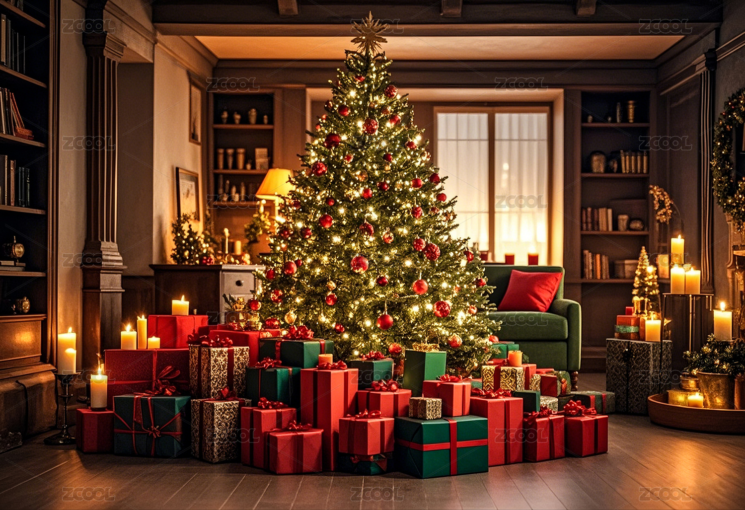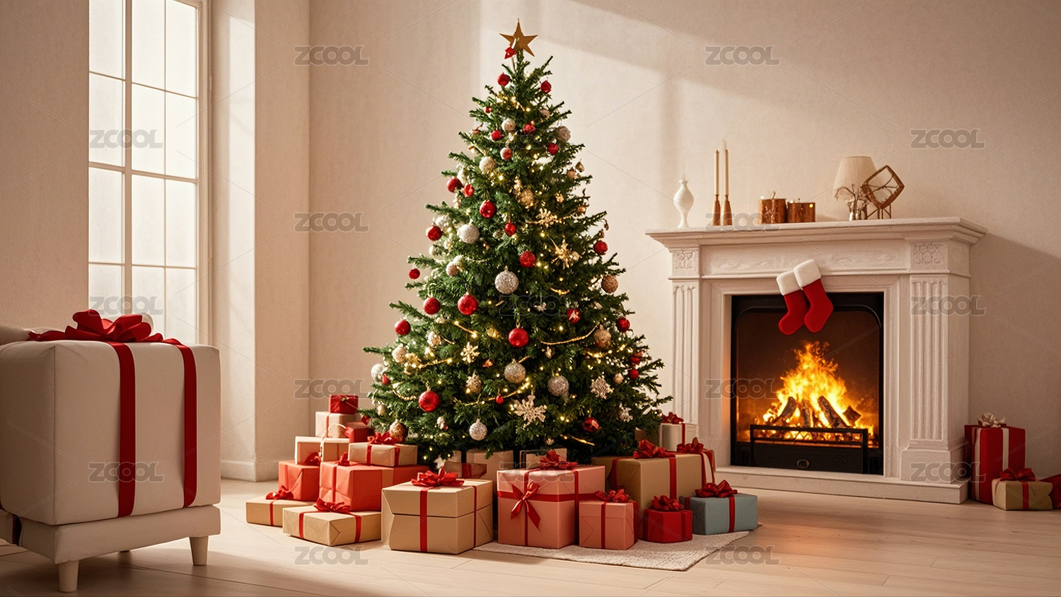 室内圣诞树和漂亮的圣诞礼物装饰圣诞节日