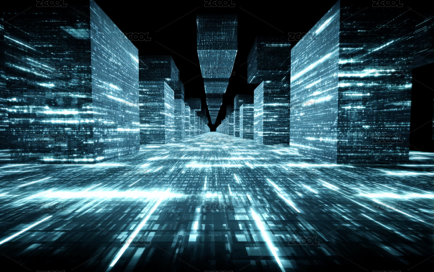 由二进制数组成的高层图形设计、科技、建筑、科幻背景图。