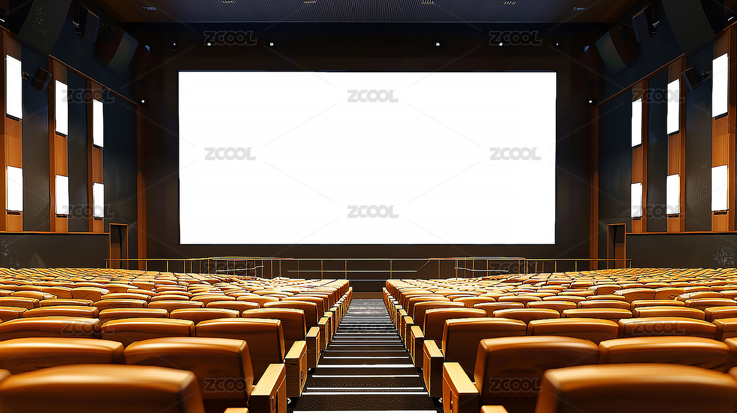 红色主题的剧场空间,舞台上有一块空白荧幕