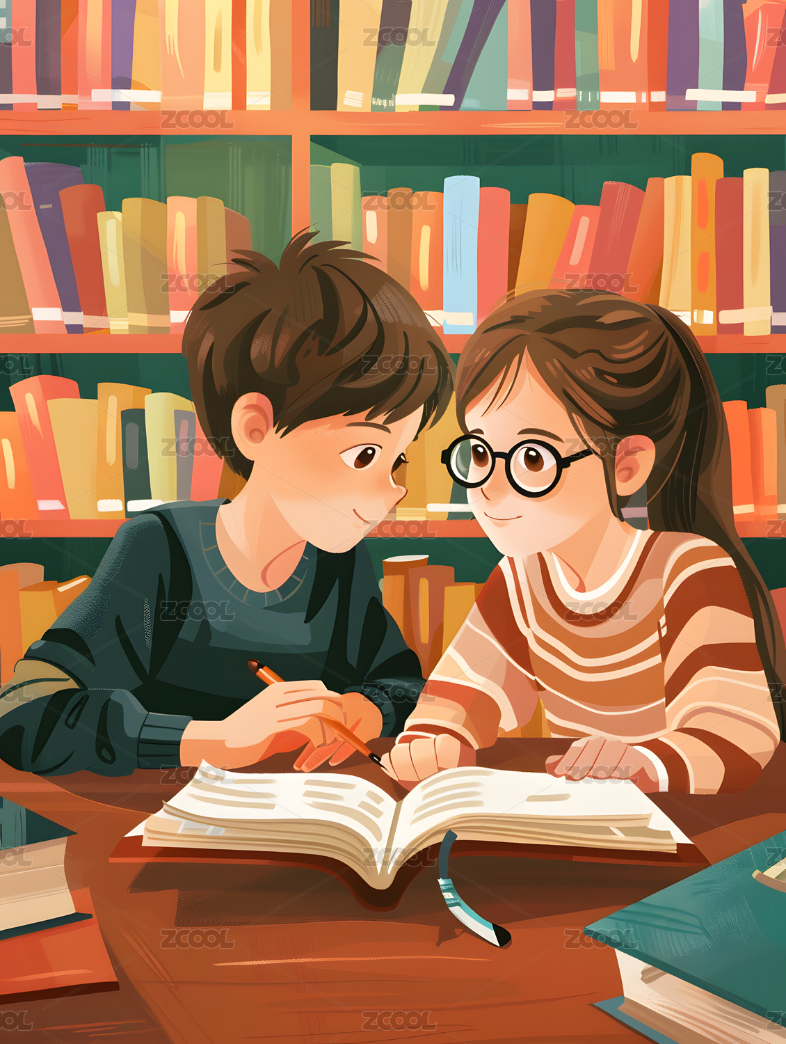 一个男同学和一个女同学在图书馆里读书